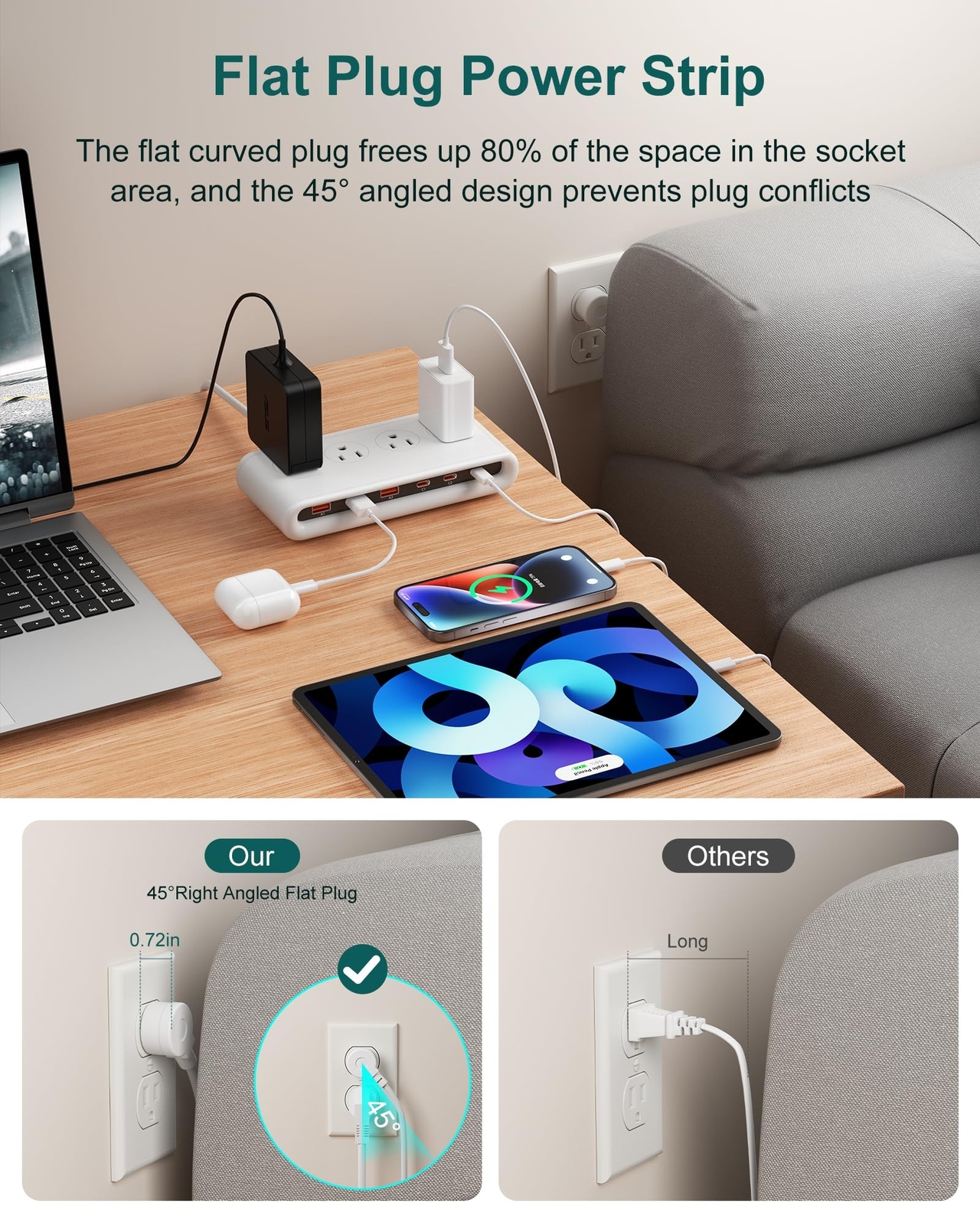 10 in 1 Flat Plug Power Strip with USB C, PD20W Fast Charging Station with 4 Outlets and 6 USB Port(3 Type C+3 USB A, 5ft Extension Cord, Non Surge Protector for Travel (White) Product Details Color: White Brand: POANES MPN: XTD-1504 UPC: Does not apply EAN: Does not apply Brand: POANES Color: White Total Power Outlets: 4 Voltage: 110 Volts Special Feature: Non Surge Protector, Lightweight, 10 IN 1 Package Dimensions: 8.62 x 4.69 x 2.4 inches Item Weight: 14.9 ounces Item model number: XTD-1504 Date First Available: December 11, 2024 Manufacturer: SHENZHEN XINTAIDE TECHNOLOGY CO.,LTD Country of Origin: China 10-in-1 Power Strip: This 5FT flat power strip turn 1 socket into 4 AC outlets and 6 USB ports (3 USB A ports and 3 USB C ports), which can charge 10 devices at the same time and keep your desktop tidy; suitable for any indoor places such as home, office and dormitory. Angled Flat Plug: With an flat head design of only 0.72 inches, the flat power strip can be easily installed in a small space, hidden behind sofa, bed, nightstand or other furniture, close to the wall; the 45 right-angle design create an extra space for other plugs below without causing obstruction. Power Strip with USB C: The USB C port can charge up to PD 20W fast charging, suitable for mobile phones and tablets, deeply loved by users. The USB A port can charge up to 5V/3A MAX and 15W MAX, which is 30% faster than other power strips. Cruise Accessory Essential & Travel Ready: This slim cruise power strip with no surge protection is definitely a must-have accessory for travel and cruise trips, as cruise lines require power strips without surge protectors. Small and lightweight, easy to carry, ideal for travel. Multiple Safety Protection & After-Sales Service: We have FCC, RoHS and ETL certifications. The USB C power strip has overload protection, overvoltage protection, short circuit protection, overcurrent protection and overheating protection, 24-hour fast customer service, if you have any problems with our products, please contact us, we will do our best to solve it for you!