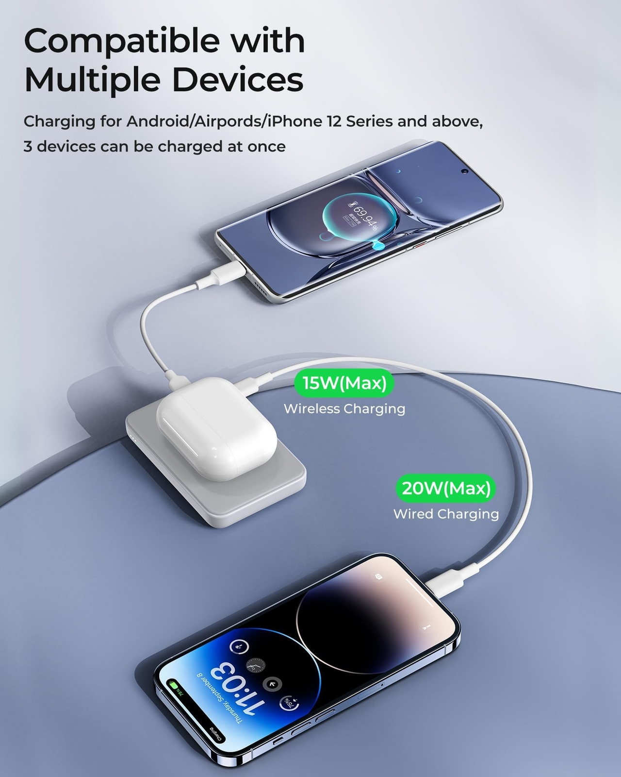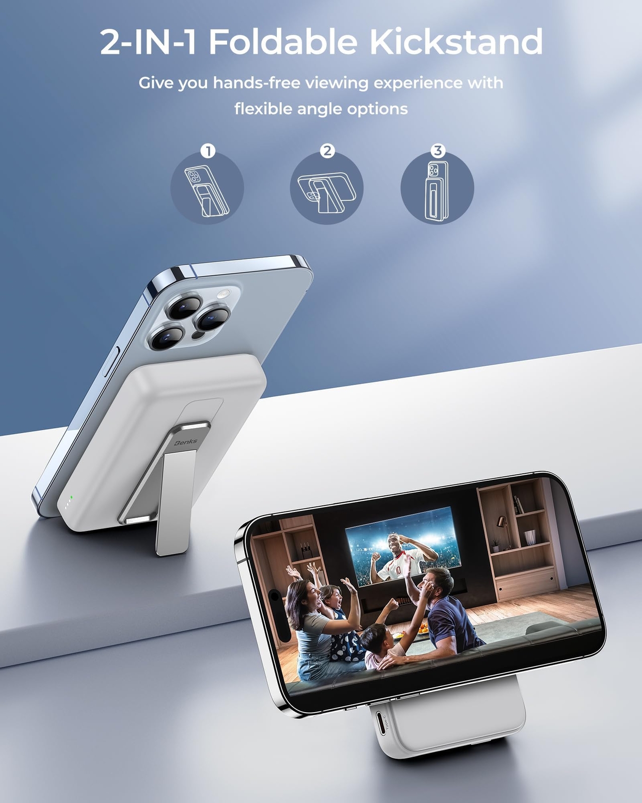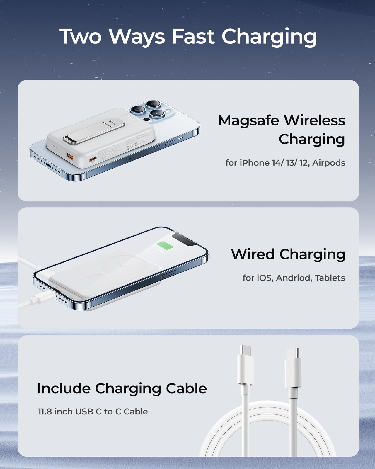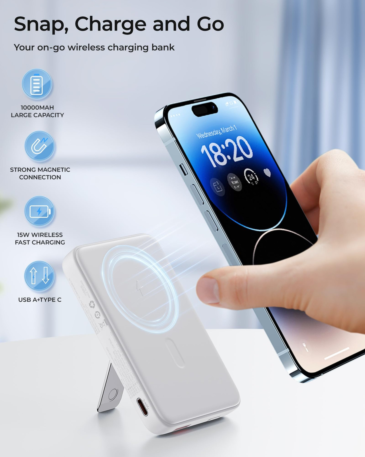 【All-Day Power】Stay connected all day long with the powerful 10,000mAh capacity of ' Foldable MagSafe battery pack, the perfect power bank for iPhone users. With enough juice to charge an iPhone 14 up to 1.9 times, our MagSafe portable charger offers peace of mind during day trips, outdoor activities, and more. Travel essential. 【Hands-Free Viewing While Charging】Take your wireless charging experience to the next level with our magnetic portable charger's built-in foldable kickstand. Prop up your phone for easy viewing while it charges, making it perfect for on-the-go entertainment. And when you're ready to hit the road, simply fold it up and take it with you as a portable wireless charger. 【Seamless Magsafe Compatibility】Our magnetic wireless battery pack is specifically designed for the latest iPhone models, including the iPhone 14/14 Plus/14 Pro/14 Pro Max, iPhone 13/13 Pro/13 Pro Max, and iPhone 12/12 Pro/12 Pro Max. Whether you use a MagSafe case or go without a case, our MagSafe power bank makes it easy and quick to power up your device. 【Enhanced Magnetic Attraction】With the upgraded Mag-suction technology, featuring powerful built-in magnets, you can enjoy a secure and stable connection between your phone and our magnetic battery charger for iPhone. Say goodbye to the frustration of slipping or separating during charging. Please note that it will not magnetically attach or work with normal non-Magsafe cases. 【Flexible 2-in-1 Charging】Charge your devices with ease using our foldable power bank wireless charger. With support for 5W, 7.5W, 10W and Max 15W magnetic wireless charging, you'll enjoy hassle-free charging. Need to charge up quickly? Switch to the 20W USB-C wired charging option for faster speeds. Compatible with a wide range of devices, including iPhones, Androids, tablets, headphones, and more. 【What You Get】' Foldable Magnetic wireless power bank with a 10,000mAh capacity, an 11.8'' white USB-C to USB-C cable, friendly customer service, and our worry-free 1-year warranty. Buy with confidence and please don't hesitate to contact us via Amazon message if you have any issues. We're here to help.