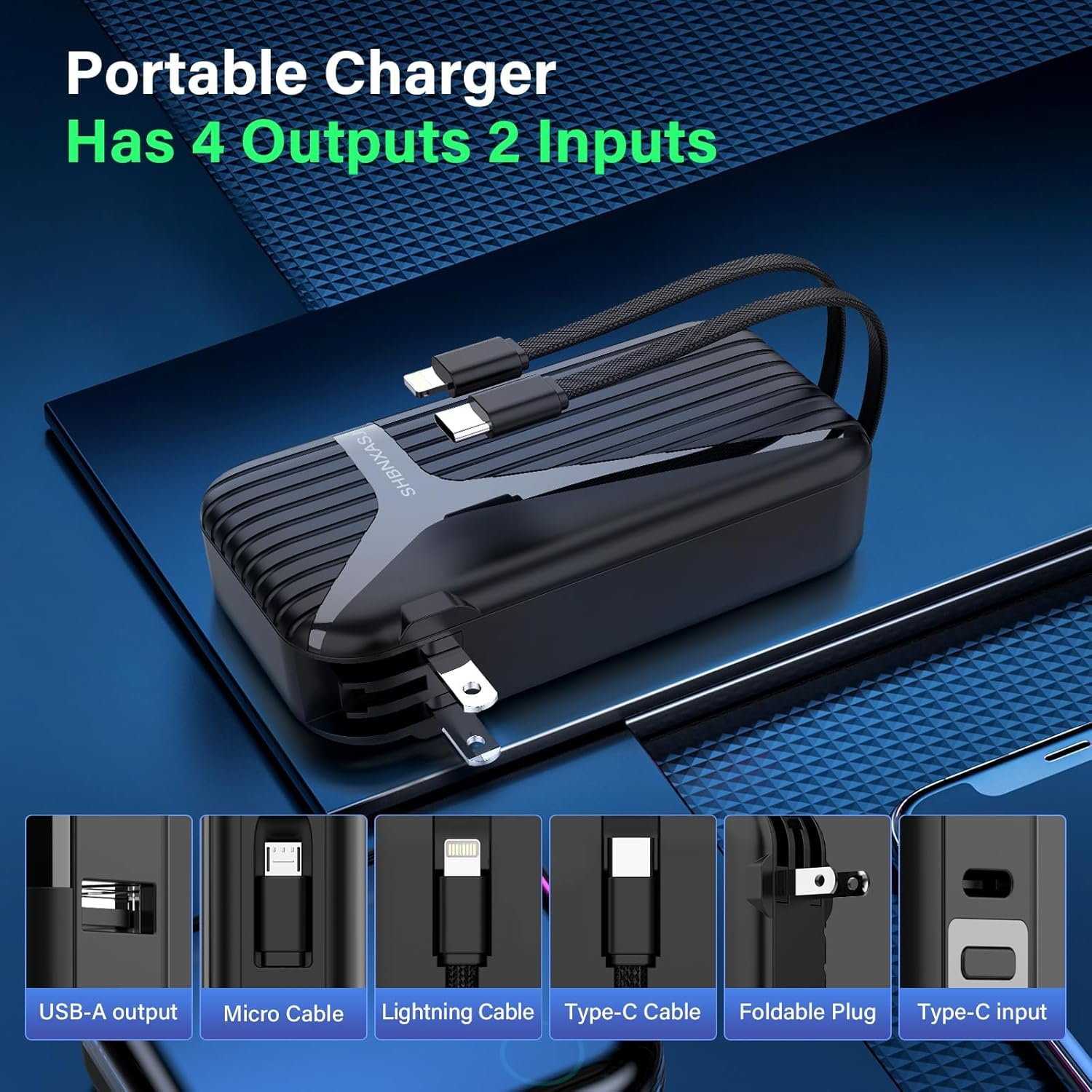 Slim 10000mAh Portable Charger with Built-in Cables