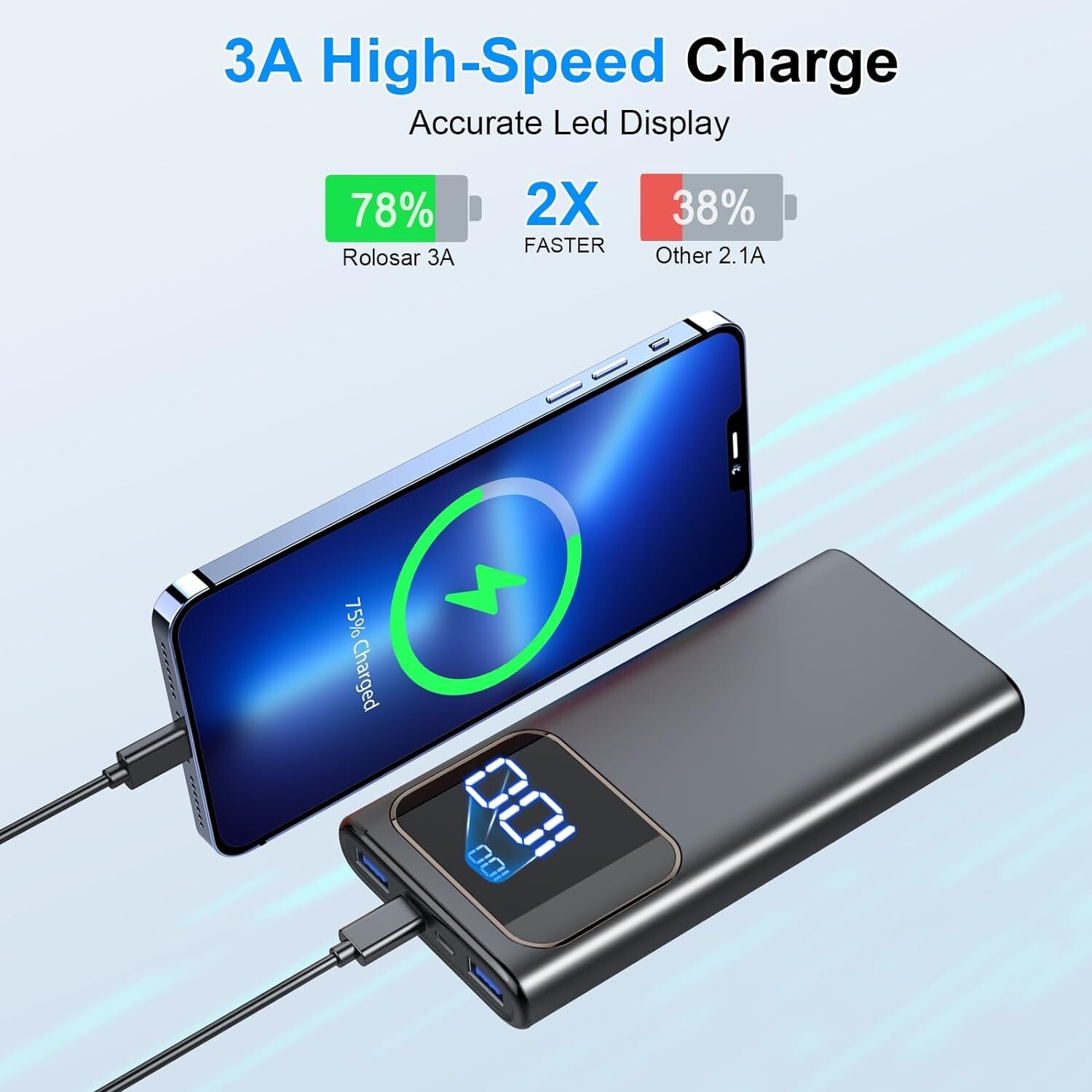 Portable Charger, 10000mAh Power Bank, Fast Charging Battery Pack with USB C/USB A Output, Tri-Outputs Digital Display Portable Phone Charger for iPhone 15 14 13 12 Pro Samsung S23 AirPods iPad Product Description Fast Charging Portable Charger: High speed 15W portable charger has 10000mAh capacity, which allows you to charge your devices multiple times. It charges iPhone 15 about 2.1 times, Samsung Galaxy S23 2 times, Air Pods Pro about 15 times.(Airline-approved) 3 outputs and 2 Input: This power bank built-in 3 outputs (3A USB C+ 2 USB) and 2 inputs (3A USB C + Micro USB). Unlike others only recharge via USB-C port, this power bank can charge devices with your USB-C cables directly. great for multi electronics users who has smartwatch, android or micro devices. Universal Compatibility: Cell phone battery pack widely compatible with iPhone, Samsung, Xiaomi, Google Pixe smartphones and other devices such as earbuds, smartwatch. At the same time, the power bank also has a low current mode to help you charge small devices more safely and efficiently. Portable and LED Digital Display: Slim portable power bank, its dimension is 5.6''x2.74''x0.67'', and weigh only 240g, easily take it anywhere on the go. Touch once power button, the intelligence LED battery level indicator will show you the remaining battery accurately to 1%. No more guessing whether need to charge it or not. 15-Layer SAFE Charging: Upgraded version 10000mAh power bank with safety polymer battery, built-in 15-Layer-protection system, protect your devices against overcharge, over discharge, excessive currents, short circuits or overheating etc., provided stable charging. FCC, CE, ROHS certificated, add safety guarantee to your equipment. What will you get: 1 x power bank, 1 x use manual, 24 month’s technical support. Any question, please kindly contact us.
