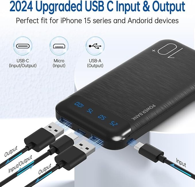 This power bank is a lifesaver for on-the-go charging! The 10,000mAh capacity lasts all day, and the dual USB ports plus USB-C (input & output) make it super versatile. I love that it charges my phone fast without overheating, thanks to the advanced safety features. The compact size slips easily into my bag, and the 3-year warranty gives me peace of mind. Perfect for travel, work, or emergencies—reliable and worth every penny!