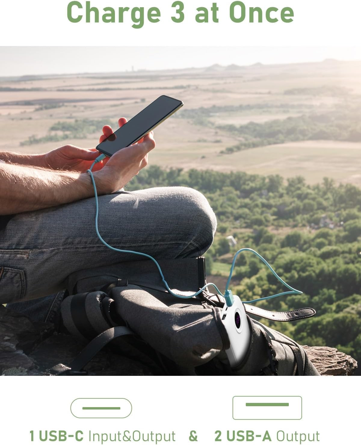 Portable Charger,10000 mAh Power Bank with USB-C(Input 10000mAh, Bright White Product Details Product Dimensions: 5.9 x 2.7 x 0.6 inches Item Weight: 8.1 ounces Item model number: K51-26-S Batteries: 1 Lithium Polymer batteries required. (included) Special features: Digital Display, Short Circuit Protection, Lightweight, Over Charging Protection, Pocket Size Other display features: Wireless Color: Bright White Manufacturer: Yueyang Paien Intelligent Manufacturing Technology Co.,Ltd Connector Type: USB Type C, USB Type A Brand: GrnOas.E Battery Capacity: 10000 Milliamp Hours Special Feature: Digital Display, Short Circuit Protection, Lightweight, Over Charging Protection, Pocket Size Longevity & Durable : 10000mAh charging capacity is enough to charge your iPhone 15 2.3 times, Samsung Galaxy S23 2 times, or AirPods Pro 15 times.As a portable charger, it's excellent camping power bank,travel worry free,compliance with safety standard. Universal Compatibility: Cell phone Portable Battery Charger Compatibile with iPhone 15 ,13, 12, 11, 8, 7, AirPods,iPads,Samsung Galaxy, Google Pixel,Android smartphones,earbuds, Tablet, headphone, speaker, fitness tracker,smart watch and other USB-charged electronic devices. GrnOas.E power bank can also charge heating vests and some smart wear. Safety Charging: Overcharge protection,Using temperature control treatment, the temperature is reduced by 20% compared with the same power bank when charging.Shielding against overcharging and short circuits while maintaining temperature control for a worry-free charge. 3 Outputs & 2 Inputs: GrnOas.E power bank built-in 3 outputs (2.4 A 2 USB-A & USB C) and 2 inputs (USB C + Micro USB), charging speed reach up to 2.4 A, provides fast charging,charge any combination of devices at full speed.It can charge 3 devices simultaneously.Two ways USB-C Charging. Accurate Percentage of Remaining Juice: With Intelligent LED display which shows you the remaining power with accurate percentage when you press once power button,help you allocate reasonably,and when you press the button twice,the digital indicator will turn off. What You Get:1 pack Slim 10000 portable charger,1* USB A cable (to charge the power bank), 3 years support for our portable battery pack.Note: USB-C cable and Lightning cable not included. Designed for 5V USB Heated Clothing: GrnOas.E Rechargeable Battery Pack for Heated Vest, Jackets, Pants and Seat Cushion Cover,delivers long-lasting warmth for your outdoor sports.NOTICE:This battery pack is designed for Heated Vest,provided that the output must be USB(NOT DC output).