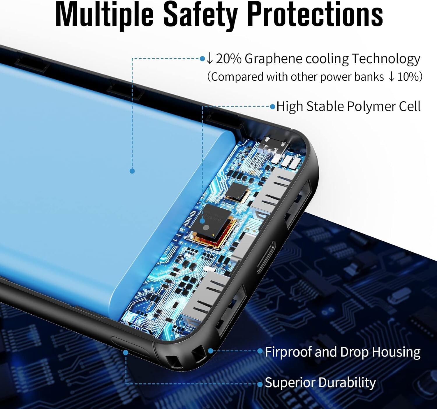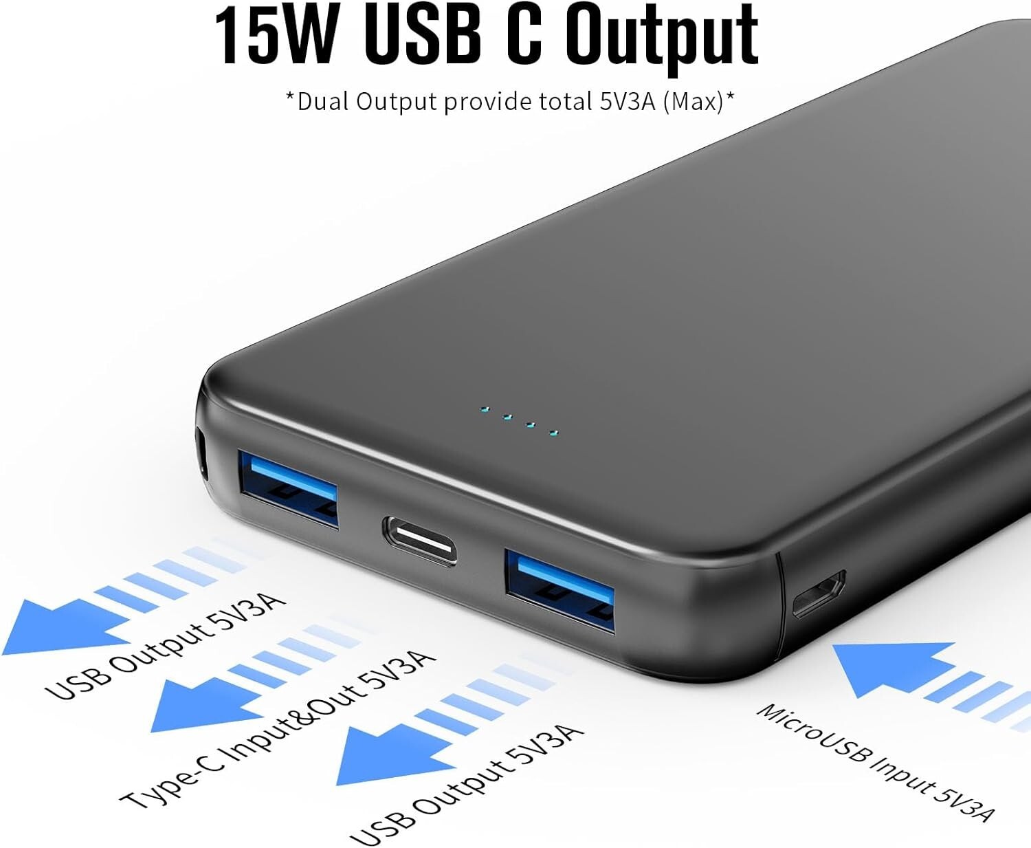 The VANYUST Portable Charger is a 10000mAh power bank with 4 ports for fast charging. It has a black color design, operates at 5V voltage, and features USB-C connectivity for both input and output. This power bank is designed for efficient charging on the go.