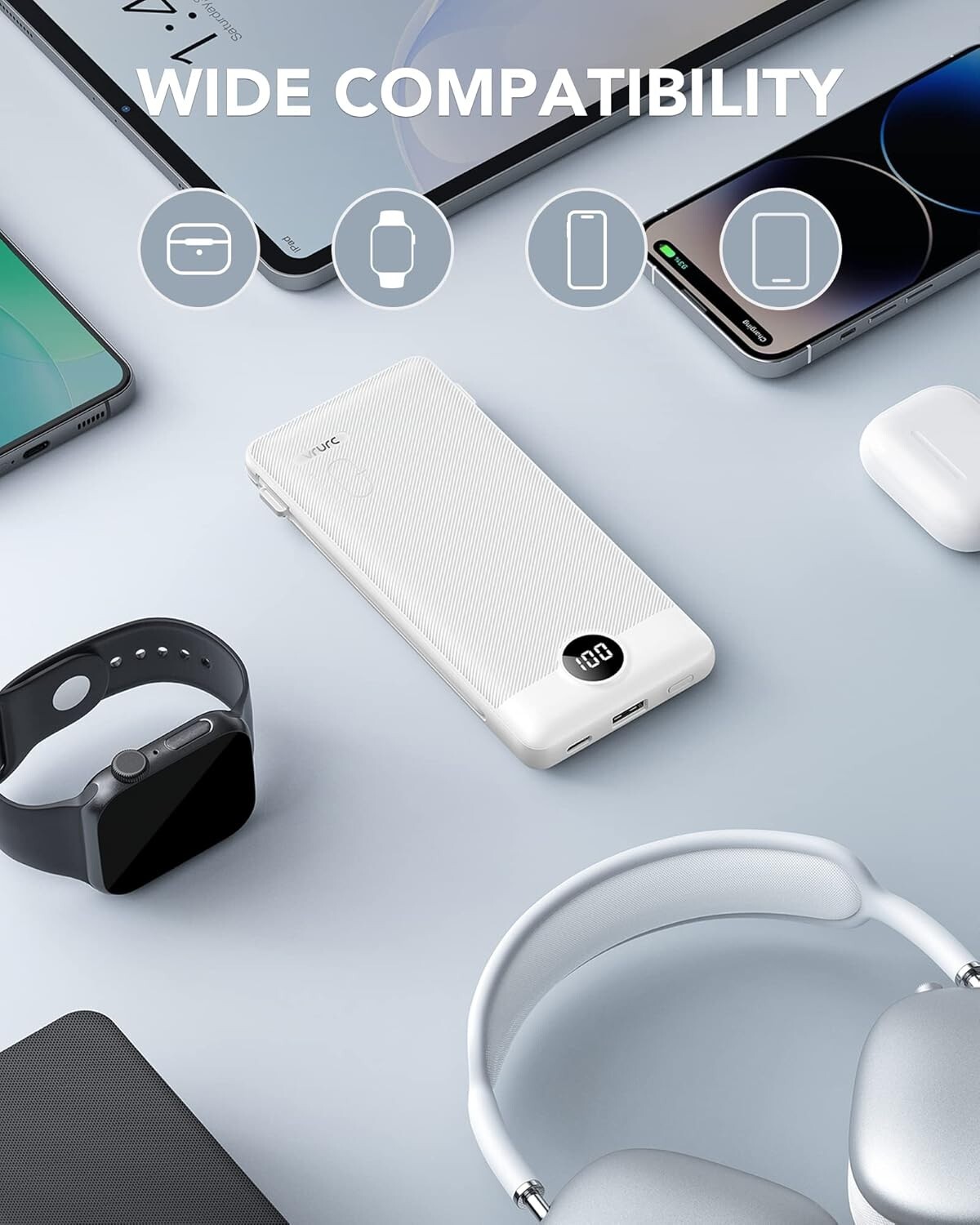 Portable Charger Built-in Cables and AC Wall Plug, VRURC USB C Power Bank 10000mAh, [2023 Upgraded Version] Phone Charger Compact Lightweight External Battery Pack for Smart Phones, Tablets etc - WHITE Power up on the go with the VRURC Portable Charger, a compact and efficient solution for all your charging needs. Equipped with three ports—Lightning, USB-C, and Micro-USB—this power bank is designed to accommodate a variety of devices, ensuring that you stay connected wherever you are. Its 10000mAh capacity provides ample juice to keep your mobile devices charged and ready to use.The charger comes with a convenient wall plug and built-in cables, making it ready to use right out of the box. Whether you're at home, in the office, or on the move, this VRURC Power Bank is an essential accessory for anyone who values mobility and convenience in their tech toolkit. Connector Type USB Type C Brand VRURC Battery Capacity 10000 Milliamp Hours Color White Special Feature Lightweight,Portable,Portable Charger About this item Versatile Charging Solution: This portable charger is equipped with built-in Micro USB, USB-C, and Lightning cables, as well as a USB port and a USB-C port, allowing you to charge a wide range of devices, including iPhones, Android phones, tablets, and other USB-C compatible devices. Compact and Lightweight Design: With dimensions of 5.9 x 2.8 x 0.7 inches and weighing only 8 ounces, this power bank is slim and portable, making it easy to carry on the go without adding unnecessary bulk. Smart LED Display: The digital LED display provides a convenient way to monitor the remaining battery life, ensuring you never run out of power unexpectedly. Additionally, the textured surface offers a secure grip, preventing accidental drops. Built-in AC Wall Plug: This power bank features a built-in AC wall plug, allowing you to charge the device directly from a wall outlet, eliminating the need for additional cables or adapters. Wide Compatibility and Capacity: With a generous 10,000mAh capacity and compatibility with various mobile devices, this external battery pack can meet most of your daily charging needs, keeping your gadgets powered up on the go. Product Description Make Life More Convenient VRURC specializes in the production of phone accessories. Through unique innovation design, we recreate and provide our users with a more convenient charging experience. VRURC 10000mAh Portbale Charger With Cords And AC Plug Product Dimensions: 5.9 x 2.8 x 0.7 in Weight: 8 Oz/ 0.5lb 2 Ways To Charge Power Bank It will be fully charged 5 Hs through the 5V/2.6 Charging. It will be fully charged 6 Hs through the AC plug Charging. *Please Note that this portable charger cannot charge the laptops!!!! PRODUCT PACKAGE: 1 X Power Bank 10000mAh 1 X User Manual Built-in Foldable AC Plug The portable charger built in cords charges itself directly via using the AC plug or the Type C port. Built-in Multi Charging Ports & Cables Meeting the people's daily charging needs, this power bank built in cable not only has a Type C charging cable, Micro charging cables, and other charging cables but also has a USB output port and Type C input & output port. It can charge multiple devices simultaneously. Smart LED Display & 3D Textured Surface The smart LED display allows you to know the remaining power at a glance. 3D texture on the surface can provide you with a better 3D touch and grip to prevent the device from slipping off. Universal Compatibility It's compatible with most of smart devices(Such as compatible with iPhone/Samsung/Android/Tablets etc) . Featherlight Convenience Featuring a slim and compact design with dimensions of 5.9 x 2.8 x 0.7 inches and a weight of only 8 ounces, our product is designed for ultimate portability. Its compact size ensures convenience on the go without adding any significant weight. How To Take Off The Charging Cable? *PLEASE NOTE: The built-in charging cable will be easier to pull out through the horizontal direction!!! If you usually insert or pull it out at an oblique angle, this wrong way of operation is easy to causes cable breakage after a long time of use. SPECIFICATIONS Capacity 10000mAh / 38.5Wh Max Power Output 15W Charging Time appr 5 hours (by 5V/2.6A Power adapter with its USB C input) Charging Time appr 6 hours (by built-in AC 220v Wall Plug) Input AC wall plug or USB C port Output USB port, USB C port, USB C & Micro cable, cable for iPhone Dimensions 151.2*70*18.2mm/5.9"* 2.8"*0.72" Weight 227g/0.5 lb
