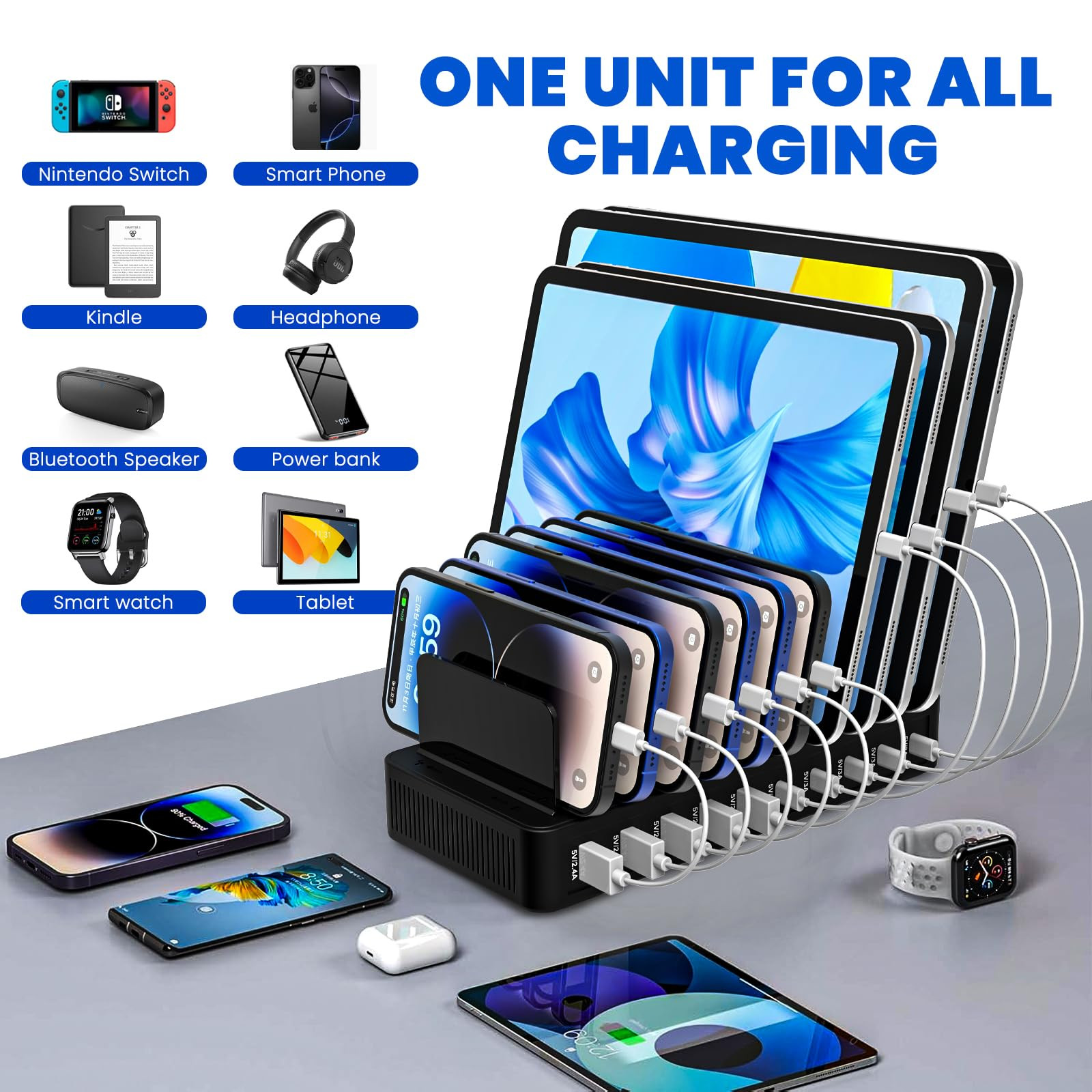 ✔✔【Advanced Charging Technology】 :This USB multiport charger can charge up to 10 devices simultaneously, with USB A port and Type-C port(Don't support for fast charge),Each port of the ipad charging station recognizes the exact current requirements of connected device ✔✔【Wide Compatibility】The multiport USB Charging Station for Multiple devices Apple supports all types of USB and Type-C charging cables, The multi device charging station is compatible with Cell Phone,Tablets, Cameras, E-reader, Bluetooth headsets,kindle,Power Bank, USB fan,MP3 /MP4 player and more. which can meet more use scenarios, such as office, restaurants,hotels,family or party;It is also the perfect practical gift for family and friends. ✔✔【Superior Protection】Built-in smart IC that provides over-current overvoltage overheat short-circuit protection of phone charging station, fireproof PC material, and UL certification ensures your devices' safety and offers them full-scale protection. ✔✔【Removable Dividers】: Easily adjust the width to any size you need, hold any USB or Type-C devices even they are in the thick cases. Perfect for Fire Kids Edition Tablet with Case. Fits for iPad,Galaxy tablets, e-readers,cell phone even in protective cases. Take the hassle out of cluttered cables, keep your desktop neat and organized. ✔✔【5FT Detachable Power Cord with 45°Right Angle Flat Plug】:The RISWOJOR multi USB charger station with flat plug 5ft power cord will fit into the tight space behind the furniture and can be used without obstructing the furniture(such as sofas, beds, and bedside tables);45° design does not affect the use of other ports of the socket ✔✔【What You Get】1✘ RISWOJOR 10 port USB charging station (Charging cable not included) with 18-month warranty. If you are not satisfied with our USB charging hub, please let us know,we RISWOJOR will give you full refund or free replacement. Your purchase is RISK-FREE!