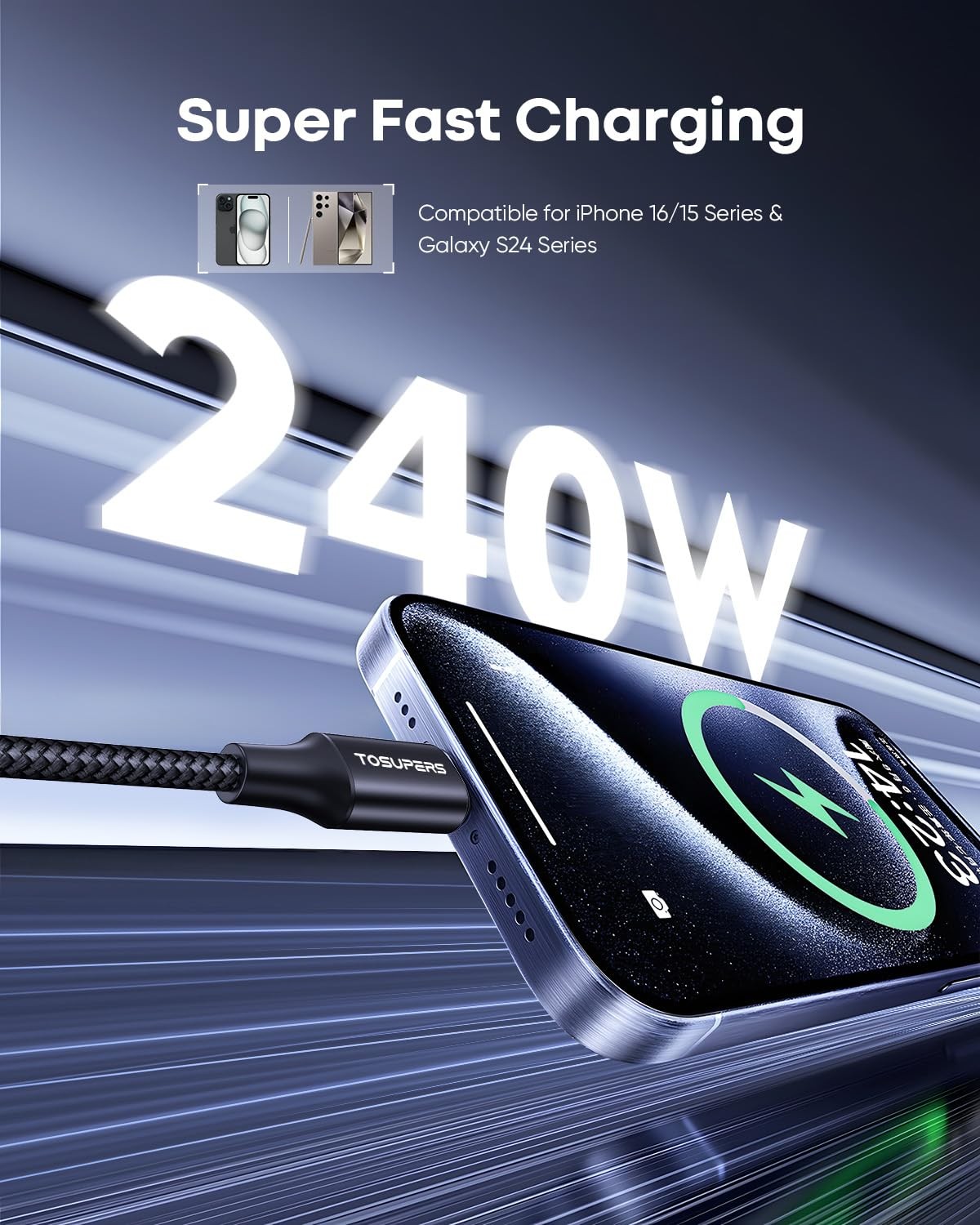USB-C to USB-C Cable 240W Fast Charging Product Parameters: Rated Voltage: 48V Charging Current: 5A Material:Nylon Braided Length: 10FT(3Meter) Pack: 2Pack (10FT*2) Product Details ✔Charge Without Boundaries: Ideal for a wide range of devices, including phones, laptops, and tablets. ✔Rapid 240W Charging Speed: 240W USB-C to USB-C cable, your iPhone 15 series reaches a whopping 80% battery in just 35 minutes. ✔Transfer Files in Seconds: Transfer movies, music, or an entire photo library in seconds with 480Mbps transfer speeds. ✔Wattage Support:240W/140W/118W/100W/96W/87W/85W/60W/45W/40W/35W/20W. Fully Compatible Device -For iPhone 16/15, iPhone 16/15 Pro, iPhone 16/15 Pro Max -For Galaxy S24, S23, S23 Ultra, S22, S22 Ultra, S22+, S21 Ultra, S21+, S21, S20 Ultra, S20+, S20 -For Pixel 8, Pixel 8 Pro, Pixel 7, Pixel 7 Pro, Pixel 6, Pixel 6 Pro, Pixel 5, Pixel 5a -For MacBook Air 2024, MacBook Air 2023, MacBook Air 2022, MacBook Air 2020 / 2019 / 2018 -For MacBook Pro 2021, MacBook Pro 2020, MacBook Pro 2019 / 2018 / 2017 / 2016 -For LenovoYoga 14s,ThinkPad X1 Series, HP-Spectre Series -For iPad Pro 12.9-inch (5th generation), iPad Pro 12.9-inch (4th generation), iPad Pro 12.9-inch (3rd generation) -For iPad Pro 11-inch (4th generation), iPad Pro 11-inch (3rd generation) ,iPad Pro 11-inch (2nd generation) -For iPad Air (4th generation), iPad mini (6th generation) IMPORTANT NOTE: 1.This is Type-C to Type-C cable. Not USB-A or Lighting connector. It can compatible almost USB-C devices 2.This cable does not support video output. 240W USB C Charging Cable: This high power 240W/5A USB C to C Cable provides you with an unparalleled charging experience, MacBook Pro 16" to 42% capacity within 30 minutes or your iPhone 15 Pro to 50% in 26 minutes. Provide Safe and Stable Charging: The new EMARK2.0 chip charging cable provides a faster, more stable for your device, maximize device safety. Precise port design can perfectly fit your device, ensuring stable charging and data transfer. Excellent Durability and Flexibility: The cable features a sturdy double-layer nylon braided construction that is flexible and tangle-resistant, strong bend resistance, and can withstand up to 36000 bends, providing long-lasting performance you can trust. Broad Compatibility: 240W Type C to Type C cable is designed for multiple devices and is compatible with all devices with USB C ports, including MacBook Pro, MacBook Air, iPad Pro, iPhone 16/15 series, Samsung phones, etc. Provides a superior fast charging solution for 240W/140W/100W/65W/60/45W/25W usb-c devices. What You Get: 240W USBC to USBC Cable, (10ft, 2pack, 240W, Nylon Braided) and 24/7 friendly customer service.