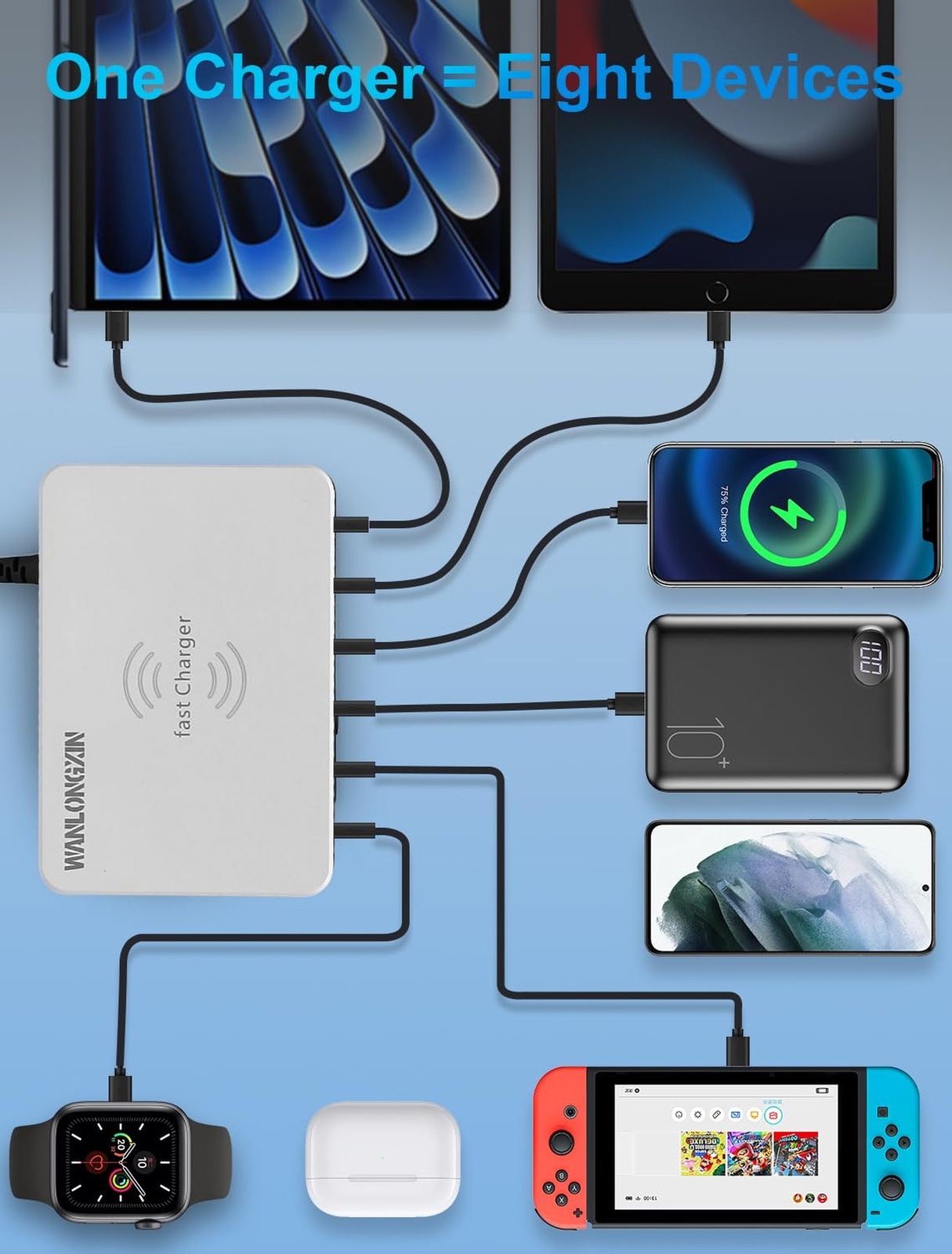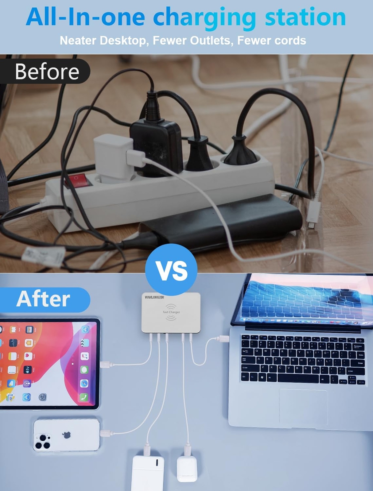 Charging Station, 100W6Port Usb Charging Station, Multiple Usb Charger Station, Charging Station for Multiple Devices, Multi Usb Charging Station, Chargers for Multiple Devices, Multi Charging Station Product Details Brand: WANLONGXIN Connectivity Technology: Bluetooth,Usb Connector Type: USB Type C Compatible Devices: Headphones, Desktop, Game Consoles, Digital Camera, Laptops Compatible Phone Models: Iphone Included Components: 1 x USB Cable Special Feature: lightweight_design, wireless charger multi charger station phone charging station USB Charger USB wall charger See more Color: Lily white Input Voltage: 100 Volts Mounting Type: Tabletop Mount Product Dimensions: 4.22 x 2.95 x 1.55 inches Item Weight: 14 ounces Item model number: WLX-818PF Date First Available: August 14, 2020 Manufacturer: Shenzhen Wanlongxin Electronic Technology Co., Ltd. Country of Origin: China CHARGING STATION FOR MULTIPLE DEVICES The charging station (100W 6-Port USB charging station) provides fast charging for all your 5V devices. This multi USB charging station is perfect for households and businesses with multiple gadgets MULTI-PORT AND FAST USB CHARGING STATION This charging station features 6 ports for simultaneous charging. The USB charging station ensures all your devices get charged quickly and efficiently. Ideal for those needing a multiple USB charger station COMPATIBILITY USB CHARGING STATION The charging station supports a wide range of devices, Including smartphones, IPad, and e-readers. This charging station for multiple devices eliminates the need for multiple chargers, Making it a versatile multi USB charging station WIRELESS AND SCREEN DISPLAY USB CHARGING STATION The charging station includes wireless charging capability and a screen display for monitoring. This multi charging station keeps all your devices powered and organized, Making it one of the best chargers for multiple devices RELIABLE USB CHARGING STATION The charging station for multiple devices delivers reliable power management. This multiple USB charger station ensures efficient charging for all your gadgets, Making it a top choice for a Multi USB Charging Station.