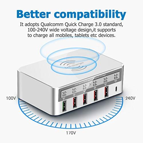 Charge Faster: Qualcomm Quick Charge 3.0 and PD charger to deliver the fastest possible charge to almost any USB device. Charging Station for Multiple Devices 100W- 5 USB A port and 1 USB PD port 10W maximum wireless charging, but your phone must supports wireless charging Real high-quality charger has short-circuit protection, overload protection, temperature protection, over-voltage protection, over-current protection, over-charge protection, using fire-retardant material PC + ABS, stable quality and reliable High-quality mobile phone charger with LED display, smart display, eye-view display, If you receive the product and have any quality problems, please send us a message and we will replace it to provide you with the best service