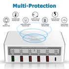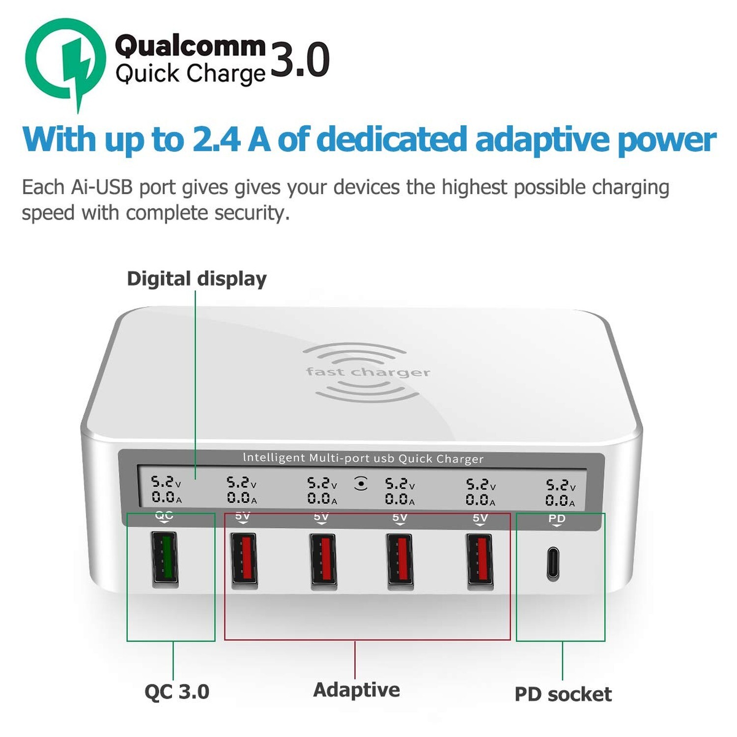 Charging Station, 100W 6-Port USB Fast Charger with QC 3.0 & PD, Compatible with Apple & Other Brand Cell Phones Product Details Brand: FUHAOXUAN Connectivity Technology: Usb,Wireless Connector Type: USB Type C Compatible Devices: Cellular Phones Compatible Phone Models: iPhone 11 / 11 Pro / 11 Pro Max, iPhone X / XR / XS / XS Max, iPhone 8 / 8 Plus, iPhone 7 / 7 Plus, iPhone 6S / 6S Plus / 6 / 6 Plus, iPhone 5 / 5S / 5C / SE, AirPods 1 / 2 / Pro, iPad Pro 12.9" / 10.5" / 9.7", iPad Air 1 / 2 / 3, iPad Mini 1 / 2 / 3 / 4, iPad 5 / 6 / 7, Google Pixel 5 XL / 5 / 4 / 4a / 4 XL / 3 XL / 3a / 3a XL, Galaxy Note 20 / 20 Ultra / 10 / 10+ / 9 / 8, Galaxy S21 / S21+ / S21 Ultra / S20 FE / S20 / S20+ / S20 Ultra / S10 / S10+ / S10e / S9 / S9+ / S8 / S8+, Galaxy Z Flip 5G / Z Fold2 5G / Z Flip / Fold, Galaxy A52 / A51 / A71 / A70s / A50s / A20s / A90 / A80 / A40s / A60 / A70 / A8s / A9s / A6s, Nexus 5x / 6p, LG G5 / G6 / G7 / V20 / V30 / V40 / V50 / ThinQ Q70, HTC 10 / U12+, iPod Nano, iPod Touch, Switch, Smart Phone, Sports Watch and Tablet See more Included Components: charging station Special Feature: short_circuit_protection, Fast Charger Fast Charging Input Voltage: 240 Volts Mounting Type: Wall Mount Amperage: 2.4 Amps Package Dimensions: 5.35 x 4.92 x 1.89 inches Item Weight: 14.7 ounces Item model number: WLX-818PF Date First Available: February 23, 2020 Manufacturer: FUHAOXUAN Country of Origin: China Charge Faster: Qualcomm Quick Charge 3.0 and PD charger to deliver the fastest possible charge to almost any USB device. Charging Station for Multiple Devices 100W- 5 USB A port and 1 USB PD port 10W maximum wireless charging, but your phone must supports wireless charging Real high-quality charger has short-circuit protection, overload protection, temperature protection, over-voltage protection, over-current protection, over-charge protection, using fire-retardant material PC + ABS, stable quality and reliable High-quality mobile phone charger with LED display, smart display, eye-view display, If you receive the product and have any quality problems, please send us a message and we will replace it to provide you with the best service