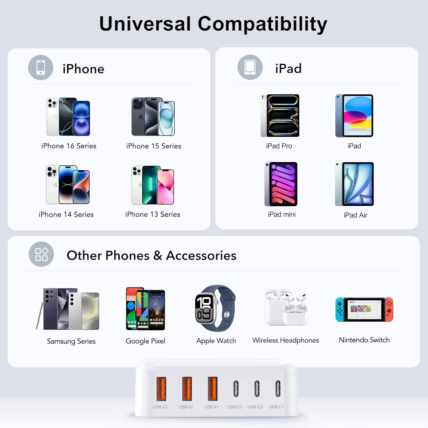 100W Charging Station (6-in-1) with 5ft Cord, 40W PD for iPhone/Samsung/Tablets Description : Organize and Power Up Your Devices! 🔌 6-in-1 Charging Hub : 4 USB-C ports + 2 AC outlets—charge phones, tablets, lamps, and laptops at once! 🔌 5ft Extended Cord : Flexible placement for desks, nightstands, or crowded spaces. 🔌 40W Fast Charging : Power Delivery (PD) rapidly charges iPhones, Samsung Galaxy, and tablets. 🔌 Universal Compatibility : Works with iPhone 15, iPad, MacBook, Android devices, and more. 🔌 Safety First : Overheat protection, fire-resistant coating, and stable voltage output. Includes : Charging station, 5ft cord, and 24-month warranty. Why Buy? Declutter Your Space : Replace messy cords with this all-in-one solution. Perfect for Travel : Compact size fits in luggage or backpacks. Fast Shipping 4.76 inches x 6.34 inches x 1.54 inches. Weight: 0.176 oz Item model number HNT-PC606 Whats in the box 5FT AC extension cable Connectivity technologies USB Mounting Type Wall Mount Color A-White Form Factor Cube Connector Type USB Type C, USB Type A Other display features Wireless Compatible Devices Tablets, Speakers, Smartwatches Item Weight 0.176 ounces Connectivity Technology USB Input Voltage 120 Volts Special features Safety Efficient Fast Charging, Universal Compatibility, Compact and Portable, 3 USB-C Port and 3 USB-A Port Charger Block, Fast-Speed Desktop Charging Station Special Feature function(f) {var _np=(window.P._namespace("DetailPageProductOverviewTemplatesJava"));if(_np.guardFatal){_np.guardFatal(f)(_np);}else{f(_np);}}(function(P) { P.when('A').execute(function(A){ A.on('a:truncate:po-attribute-truncate-6:updated', function(data) { var isTruncated = !data.truncateInstance.getIfTextFits(); var seeMoreElement = document.getElementById('po-attribute-see-more-id-6'); if(seeMoreElement) { seeMoreElement.style.display = isTruncated ? '' : 'none'; } }) }); })); Safety Efficient Fast Charging, Universal Compatibility, Compact and Portable, 3 USB-C Port and 3 USB-A Port Charger Block, Fast-Speed Desktop Charging Station See more Package Dimensions 6.34 x 4.76 x 1.54 inches Compatible Phone Models function(f) {var _np=(window.P._namespace("DetailPageProductOverviewTemplatesJava"));if(_np.guardFatal){_np.guardFatal(f)(_np);}else{f(_np);}}(function(P) { P.when('A').execute(function(A){ A.on('a:truncate:po-attribute-truncate-4:updated', function(data) { var isTruncated = !data.truncateInstance.getIfTextFits(); var seeMoreElement = document.getElementById('po-attribute-see-more-id-4'); if(seeMoreElement) { seeMoreElement.style.display = isTruncated ? '' : 'none'; } }) }); })); iPhone 16/16 Plus/16 Pro/16 Pro Max, iPhone 15/15 Plus/15 Pro/15 Pro Max, iPhone 14/14 Plus/14 Pro/14 Pro Max, iPhone SE (3rd generation)iPhone 13/13 Mini/13 Pro/13 Pro Max, iPhone 12/12 Mini/12 Pro/12Pro Max, iPhone SE (2nd generation), iPhone 11/11 Pro/11 Pro Max.iPhone XS/ XS Max, iPhone X/ Xr, iPhone 8/8 Plus, iPhone 7/7 Plus, iPhone 6/6 Plus/6s/6s Plus, iPhone 5/5S/5C, Samsung Galaxy S23 Ultra/S23/S23+/S21/S21+/S21 Ultra 5G/ S22/S22+/S22 Ultra/Note10/10+, Note 20/20 Ultra 5G, S20/S20+/S20 Ultra 5G/S20 FE(Fan Edition) 5G, Samsung Galaxy Z Fold 4/Z Fold 3/Z Fold2 Z Fold2 5G/Fold/Z Flip/Z Flip 5G/Z Flip 3/Z Flip 4, Samsung Galaxy S10/S10 Plus/S10e/S9/S9 Plus/S8/S8+/S8, Samsung Note 20 5G/Note 10 Plus 5G/Note 10/Note 9/Note 8/Galaxy A90/A80/A72/A715G/A70s/A70/A60/A53/A52/A51/A42/A41/A40/A32/A31/A22/A21s/A21/A20/A12/A11/A10/A9/A8/A7/A6/A5/A3/A03s/A02s, Google Pixel/ Pixel 2/ Pixel 3/ Pixel 4/ Pixel XL/ Pixel 2XL/ Pixel 3XL/ Pixel 4XL, LG G7 ThinQ/ G6/ G5/ Stylo 4/ V20/ V30/ V35/ V30S/ V40 ThinQ Plus, Moto G Play 2023/G 5G 2022/G Stylus 5G 2022/G Pure/G Power 2022/2021/G Stylus/G Play 2021/G Fast/One 5G Ace/G200/G60S/G100/G30/G10/G9/G8/G7 (Plus,Play,Power),G6/G6 Plus/Z4/Z3 Play/Z2 Force See more Included Components 5FT AC extension cable