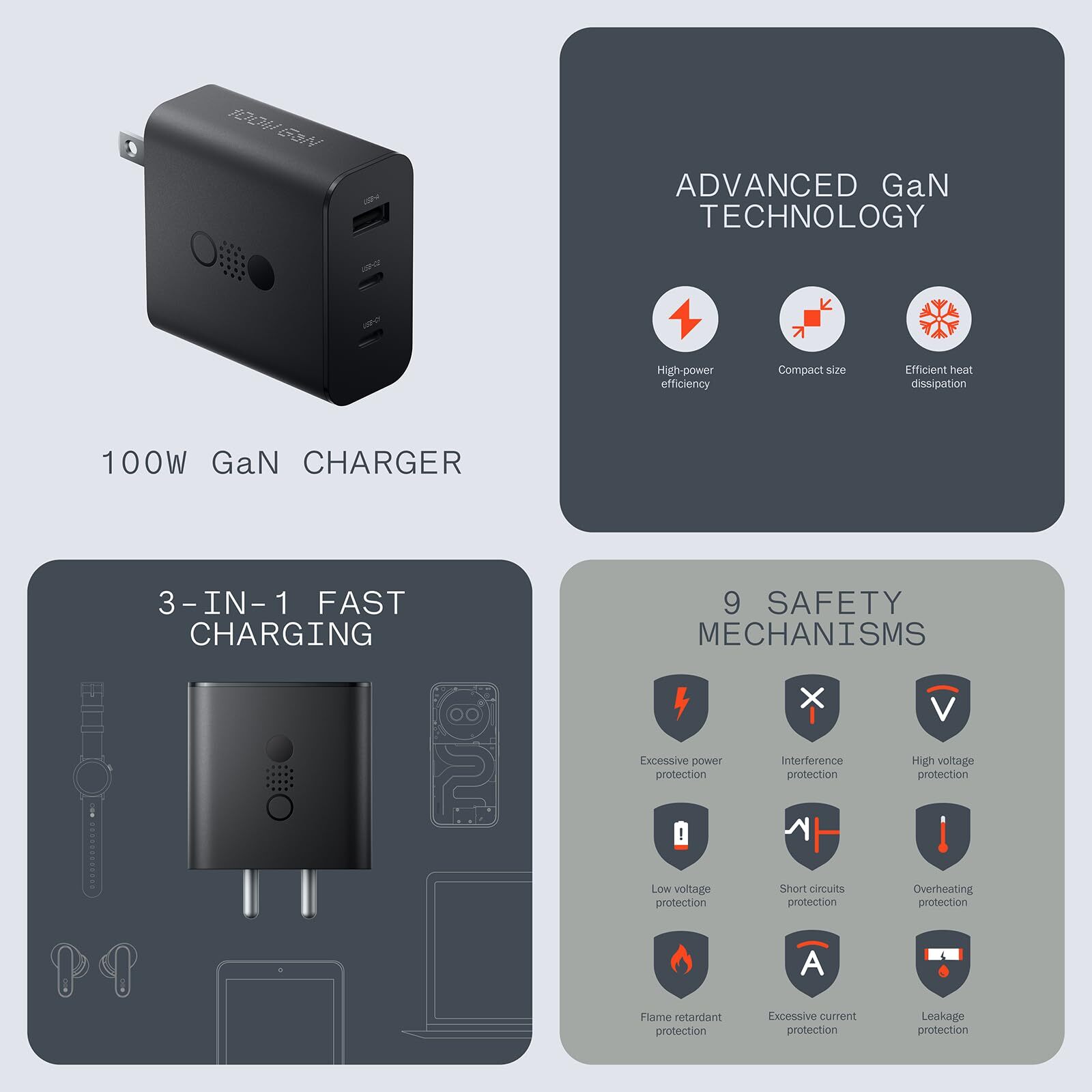 3-IN-1 FAST CHARGING:Charge your phone, tablet and notebook all at once using a single charger. With 2 USB-C ports and 1 USB-A port, you get to power three devices when the tank is low. Charging, simplified. Multi-port combination output:USB C1/C2+USB C2/C1: 65W+35W / 45W+45W (100W Max), USB C1/C2+USB A: 65W+30W (95W Max), USB C1+USB C2+USB A: 45W+45W+10W (100W Max) 100W GaN Fast Charger: get a seamless performance across your devices with a maximun output of 100W, whether you use both USB-C ports or a mix of USB-C and USB-A ports All-Round Protection: CMF Power 100W GaN toasts safeguards against short circuits, overheating, excessive currents, high voltage, low voltage, interference, as well as flame retardant protection for the charger's outer shell. Intelligent Power Distribution: CMF Power charger can distributes the voltage and current evenly according to the port you are using or if you are using several charging ports at the same time, thus Ensures the optimal charging speed for all devices.