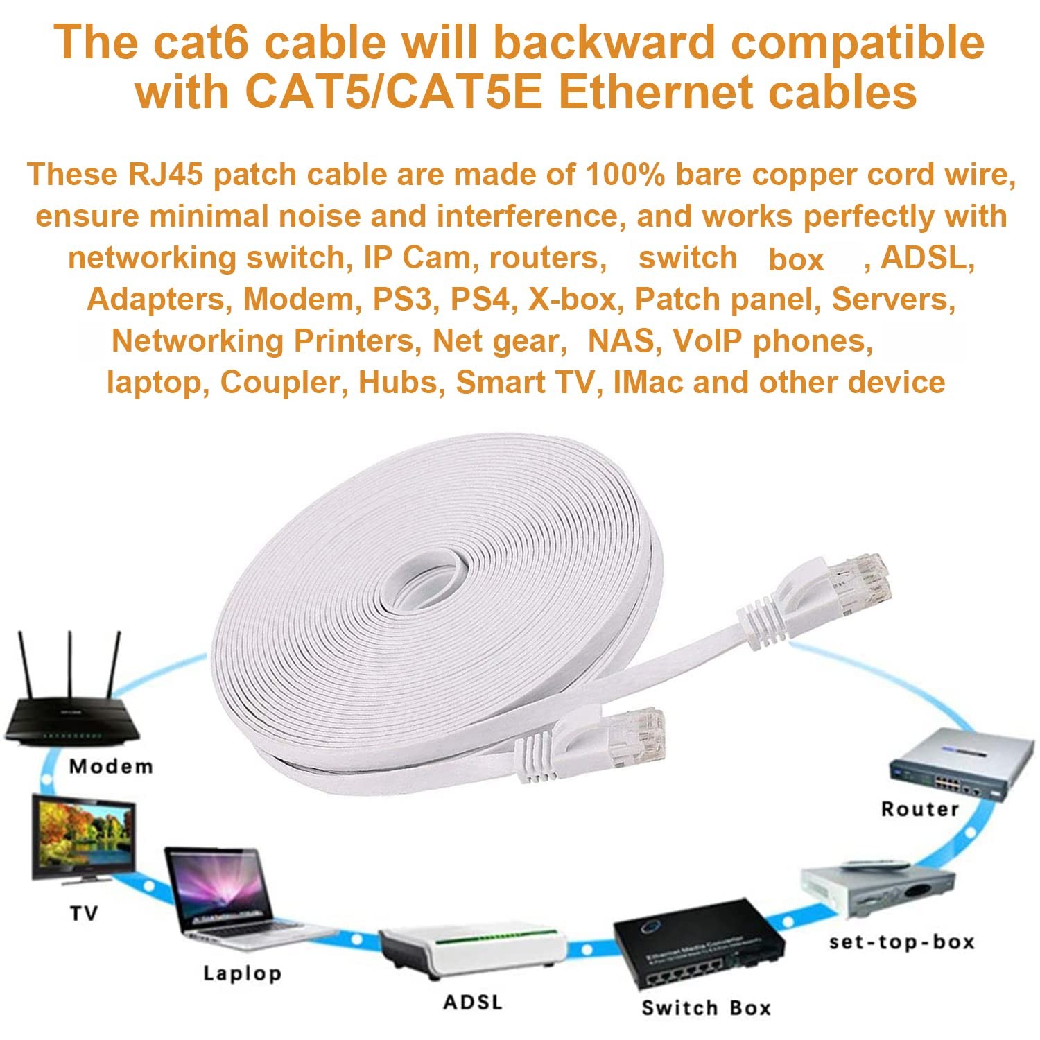 Ultra Slim and Flat Profile At a thickness of just 0.06 inch, the Cat 6 Flat Network Ethernet cables are perfectly camouflaged underneath carpets, walls, or even behind furniture. This specially designed flat cable makes it easy to fit between spaces, improving the look of your home or office. Built for Speed and Reliable Connectivity Our Cat6 Ethernet cable is capable of transmitting data at speeds of up to 10 Gbps over 100 ft of cable with increased transmission frequencies of up to 250 MHz. It is constructed with 4 twisted pairs (UTP) of copper wires, with RJ45 connectors at both ends of the cable. Compared to the Cat 5e network Ethernet cable, the more stringent specifications and improved quality in twisting of the wires provides better protection from crosstalk, noise, and interference that can degrade the signal quality. Range of Application: Intended to wired home and office networks. RJ45 connectors provides universal connectivity for computers Laptop and usb hub network components, such as PCs, routers, computer servers, printers, NAS, switch boxes, Xbox 360, Xbox one, network media players, VoIP phones, Ip Cameras, PoE devices, inline coupler, rj45 cat6 keystone jack, Ethernet Unmanaged Switch, modem, Ethernet Adapter, Wi-Fi Range Extender, wireless repeater, booster and more. Specifications: - Cable Type: CAT6 4-Pair UTP - Connector Type: RJ45 - Outside Diameter: 5.8 ± 0.3 mm (0.23 ± 0.01 inch) - Conductor Material: 100% Bare Copper - Contact Plating: 50 Micron Gold Plated - Conductor Gauge: 32 AWG - Cable Performance: Up to 250 MHz Package Contents 1 x Cat 6 Ethernet Cable 100 ft White 10 x cable ties 20 x cable clips High-performance Cat6 100 feet ethernet cable with high bandwidth of up to 250 MHz guarantees high-speed data transfer for server applications, cloud storage, video chatting, online high definition video streaming, and online gaming Ultra-thin 100 ft flat cable helps avoid tangled cords and saves space, can't even feel or see the cable run under a rug or carpet and easier to line up against the wall. 100 ft cat6 cable bundled with 20 cable clips & 10 ties, to nailed to the wall, or tie to the table legs, no mess cables in you house. UTP(Unshielded Twisted Pair) long cat cable with RJ45 Connectors and are made of 100% bare copper wire, ensure minimal noise and interference. This long ethernet cable supports all devices with RJ45 Jacks. Provides universal connectivity for network equiment, PC, Laptop, Computer Servers, printer, Switch Boxes, Routers, Modems, network media players, NAS, VoIP phones. What You Get: 1 * ethernet cable 100 ft, 20 * flat cable clips, 10 * cable ties.