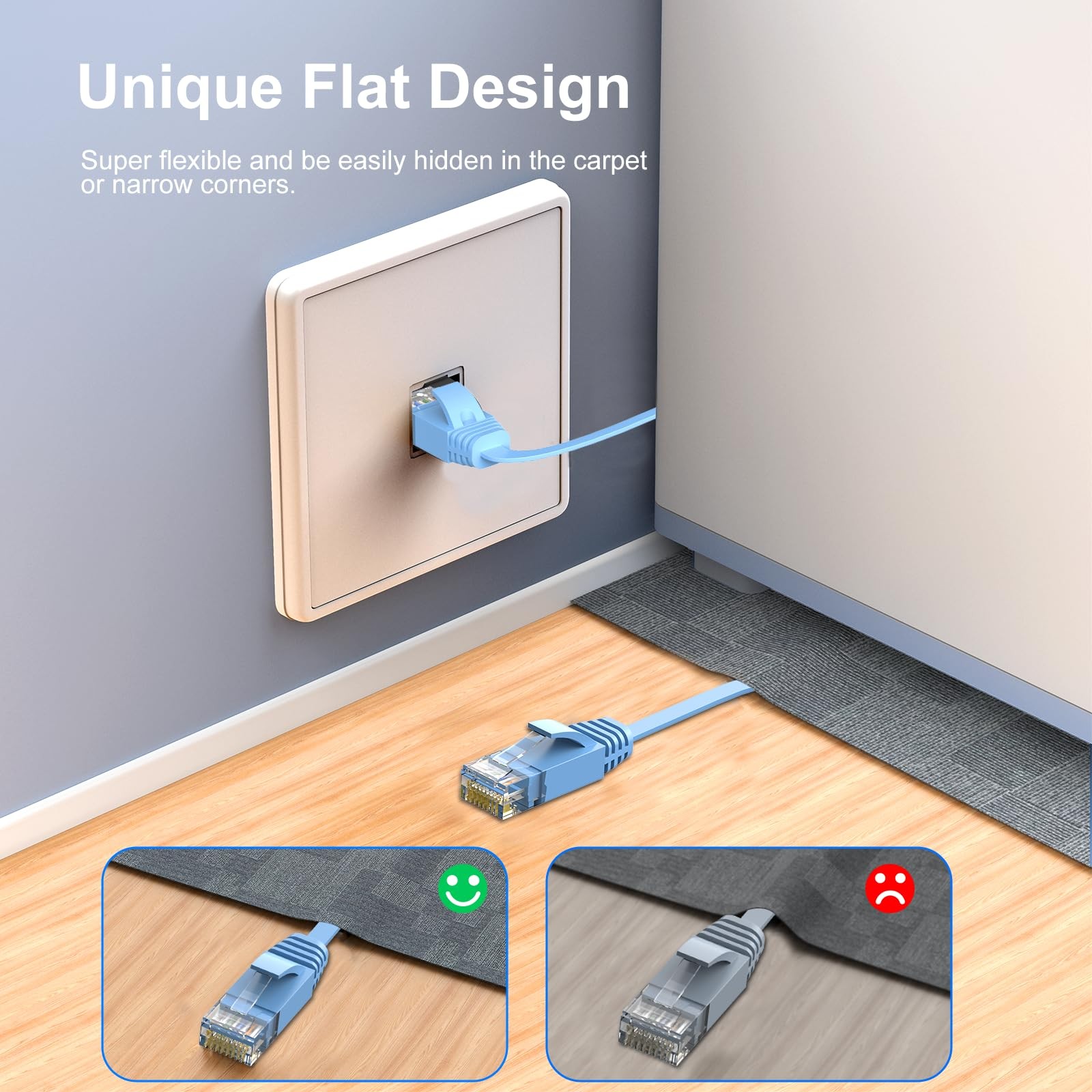 Tips: Cat 6 ethernet cable is flexible FLAT design, supports 10Gbps 550MHz, OFC, 30AWG Wide Compatibility: Cat6 Ethernet cable connects all Gigabit LAN devices—PCs, servers, printers, routers, and more. Supports Gigabit 1000 BASE-T, 100 BASE-T, and 10 BASE-T, meeting Category 6 standards (TIA/EIA 568-C.2) High-Speed Performance: Experience lightning-fast data transfers with up to 500 MHz bandwidth and 10 Gbps speed, ideal for server applications, cloud storage, HD video streaming, and gaming Space-Saving Flat Design: Flat Cat6 network cable is designed to prevent tangles and save space. It's highly flexible, making it easy to run under carpets, around doors, rotating arms, or drawers Premium Quality Construction: Made from 100% bare copper wire, UTP Ethernet cable features RJ45 connectors with gold-plated contacts, molded strain-relief boots, and a snag-less design to ensure secure connections and minimize signal interference Professionally Network Tested: Cat6 Ethernet cables are professionally network tested to ensure performance and durability, reducing the need for frequent replacement and providing long-term reliability Easy Cabling: Includes 35 Cable Clips and 4 Straps for neat installation