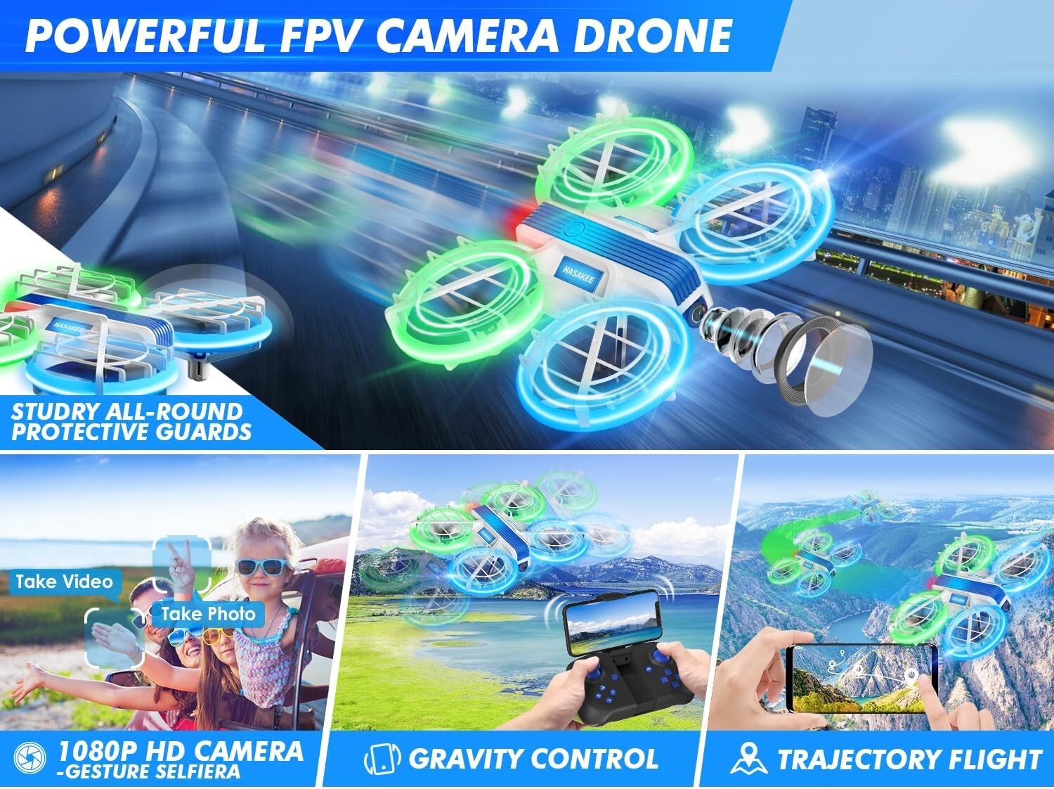 Drone with Camera 1080P HD FPV for Kids and Adults,Hobby RC Quadccopter for Begi Description : 【1080P FPV Camera & Gesture Selfie】M1S equipped with 90°manual adjustable 1080P HD FPV camera captures better aerial photos/videos. Post a V sign or palm in front of the camera, the drone can automatically take photos or video. It also support to take photo/video by pressing ONE-KEY. Good for selfie. 【Safe and Durable Toy Drone】Powerful protection is a unique feature of the M1S compared to other drones on the market. All-round sturdy propeller guard ensures a secure flight which protects your kids to avoid injury from spinning propellers as well as protect the propellers and motors from being collided. Safe and Durable Camera Drone. 【Perfect Drone for Beginner】Powerful protection features make the M1S camera drone perfect for beginners and kids. With its other user-friendly features such as One-key Takeoff/Landing, Altitude Hold, Low Battery Warning, Emergency Landing and Headless Mode. Easy to Start Fly for beginners. 【More Fun Features】M1S features with stunts like 3D Flips,Circle Fly,Trajectory Flight, Voice Control,Gravity Control. You can control the drone through the built-in G-sensor, adjusting the vertical and horizontal of on smartphone without a remote controller 【Vibrant Blue-Green LED Lights】The four frames of the mini quadcopter are equipped with ultra-bright green and blue LED to light up the sky with every flight. It looks super cool at night and during the day. 4 different lighting modes to increase the fun of flying at night. The different color lights in front and back of the drone can also help you easily judge the direction at night.