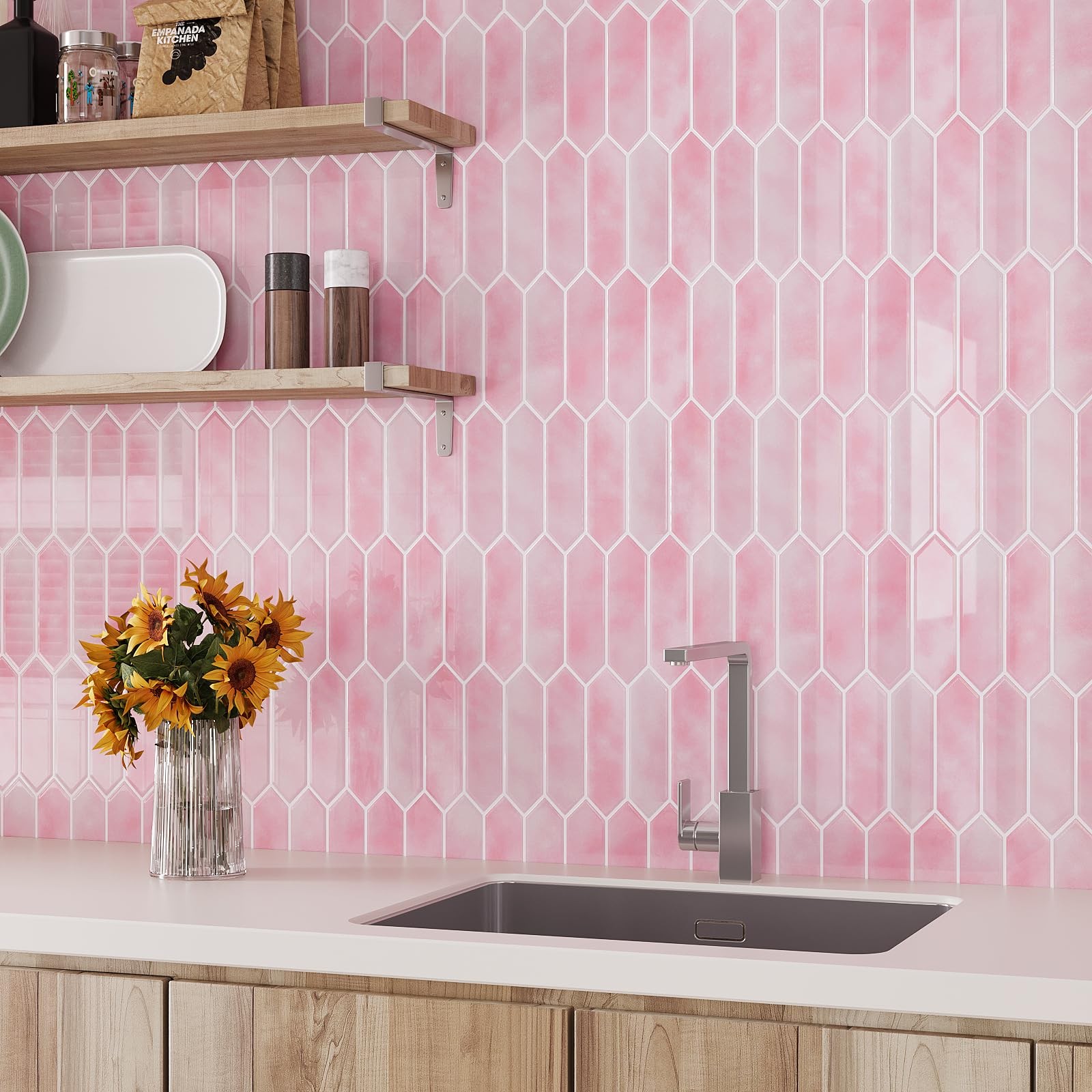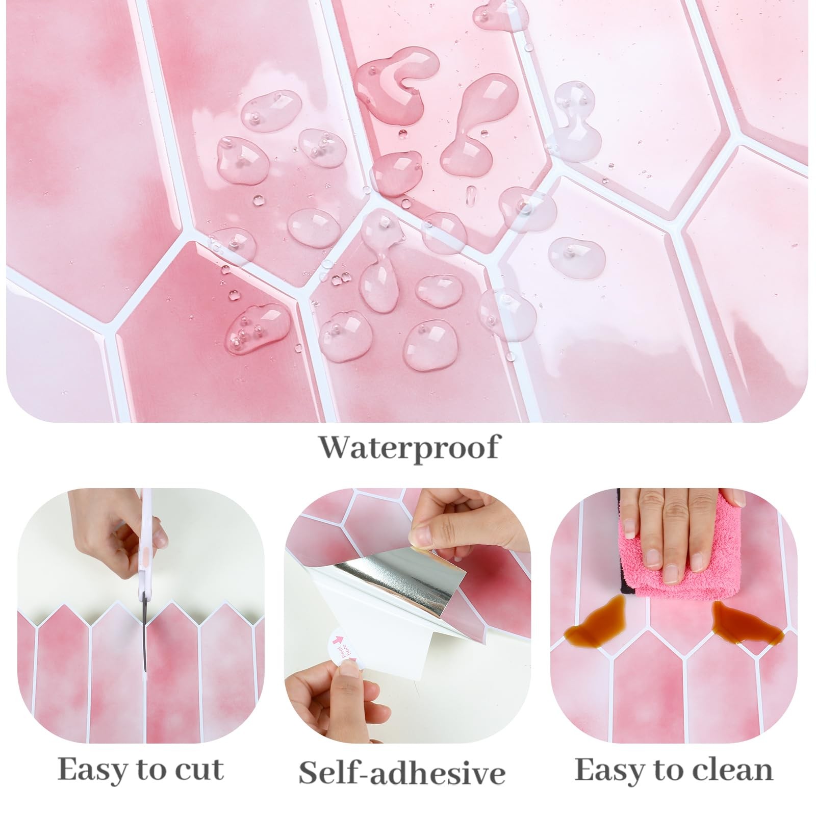 Size & Material: Each tile measures 12''x12'', thickness is 0.05'', 10 sheets per pack, total covers about 10 square feet. Stylish pink long hexagon tile design, white grout. Realistic tile effect with 3D texture. Made of premium vinyl, glossy finish, flexible, light weight, durable, not easy to crack, not fade over time Features: Pink peel and stick backsplash is waterproof, oil-proof, dust-proof and moisture-proof, making it easy to clean and maintain. Heat resistant, withstand high temperature around the stoves, protect the walls from splashes and oil. Removable tiles, no residue after removal, no damage to walls, friendly to renters and homeowners. Good adhesion, thick and durable, providing great covering effect Easy to Install: Pink tile backsplash, just peel and stick! No extra glue, no grout, no mess, no special tools and no experience needed. A quick and inexpensive solution to transform your living space. Flexible and can be bent around the corner. Easy to cut into any sizes, meet your different needs. Repositionable when making mistake, friendly to beginners. There are detailed installation instructions on the box Application: Pink back splash tiles are versatile and can be used in a variety of settings. Pink peel and stick backsplash for kitchen, bathroom, shower, stove, vanity, laundry room, kitchen island, fireplace, bedroom, apartments, farmhouse, living room, RVs, stairway, pantry, workshop, restaurant and home decor Tips: Self stick wall tiles can be used on flat and smooth surfaces. Textured and rough surfaces are not recommended. Due to light and screen resolution issues, products and images may be slightly off-color. Please consider 10% cutting loss and purchase enough tiles at one time to avoid slight color differences between batches