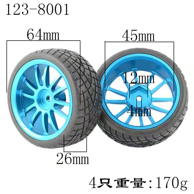 Rc Car Aluminium Alloy Wheels and rubber tires. WHEELS ARE SUPER DURABLE, NOT LIKE THE PLASTIC ONE, IT IS FULL METAL! Will fit 1/10 onroad rc cars. Specifications: Material:Aluminum alloy Offset: 3mm Heel Size:5.2 x 2.6cm/ 2.05 x 1.02inch (Dia x W) Hex adapters:12mm Rubber Tires Wheels and tires are not glued together Package include: 4 x metal Wheels 4 x Rubber Tires Condition: New NOTICE: The wheels and tires are not glued together and must be glued before use. Please carefully check the tire size before purchase, whether it is the same as your model tire size, and confirm it again before payment, so as not to return the refund, thank you, wish you a happy shopping.