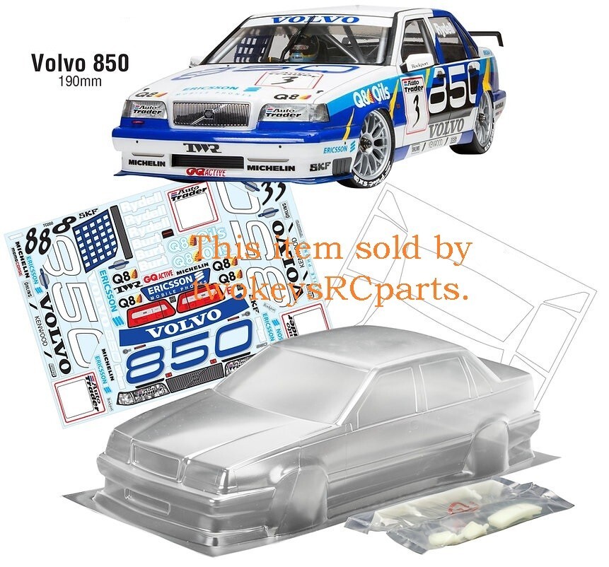 AS ALWAYS - before purchase - check the specs given below to ensure this body shell is suitable for your needs. CLEAR UNPAINTED LEXAN BODY SHELL to suit a 1:10th scale race or touring car. Body shell is as per pics #3 ~#10 --Volvo 850 Sedan -supplied with BTCC decals -pics #12 & #13. Pics #1, #2 are for reference only and may show slight differences to the body supplied and as an aid for decal placement (no decal instructions are included). Also supplied are plastic rear view mirrors, rear wing and front grill -pic #11 Body shell is for a chassis (wheelbase) of 258 mm and a wheel track of 190mm. Item is new. Shells are covered with clear spray film. Note that often shells are trimmed for freight purposes so excess plastic may be less than shown above. This item will be sent in a box (for safety) not a bag. Part # 050 Check out other great bargains in my E b a Y store , including more body shells and body accessories. I am not a "drop shipper", all products are in stock in Australia being sold by an Australian seller. POSTAGE - AUSTRALIAN CUSTOMERS . If you want to use the Express Post service please buy one item and select Express post, then buy any other items you want with regular post (the default option). All items will be sent together via Express Post service……… INTERNATIONAL CUSTOMERS . For post quotes for multi item orders please message me. Thanks. All duties and taxes (if applicable) are the responsibility of the buyer. If you have any questions or special requests regarding this please feel free to message me. Manufacturers are constantly improving products and changes are made without prior notice. This means that changes can be made to products (including slight colour changes) from time to time. These changes in no way constitute any intent to change the basic description of an item, nor do they constitute a reason for an items return or warranty replacement. Return Policy: Any returns will be handled as per Ebay’s return policy. Returned items must be new, unopened and undamaged. Opened returns will attract a 50% “reduced value” fee. Any unrecoverable costs and fees incurred (by me) will be deducted from any refund issued. Warranty: items have a 30day warranty, except drift wheels – which is ‘dead on arrival’ only. Warranty doesn’t cover crash damage, poor maintenance, misuse or incorrect assembly. Warranty covers sold items only.