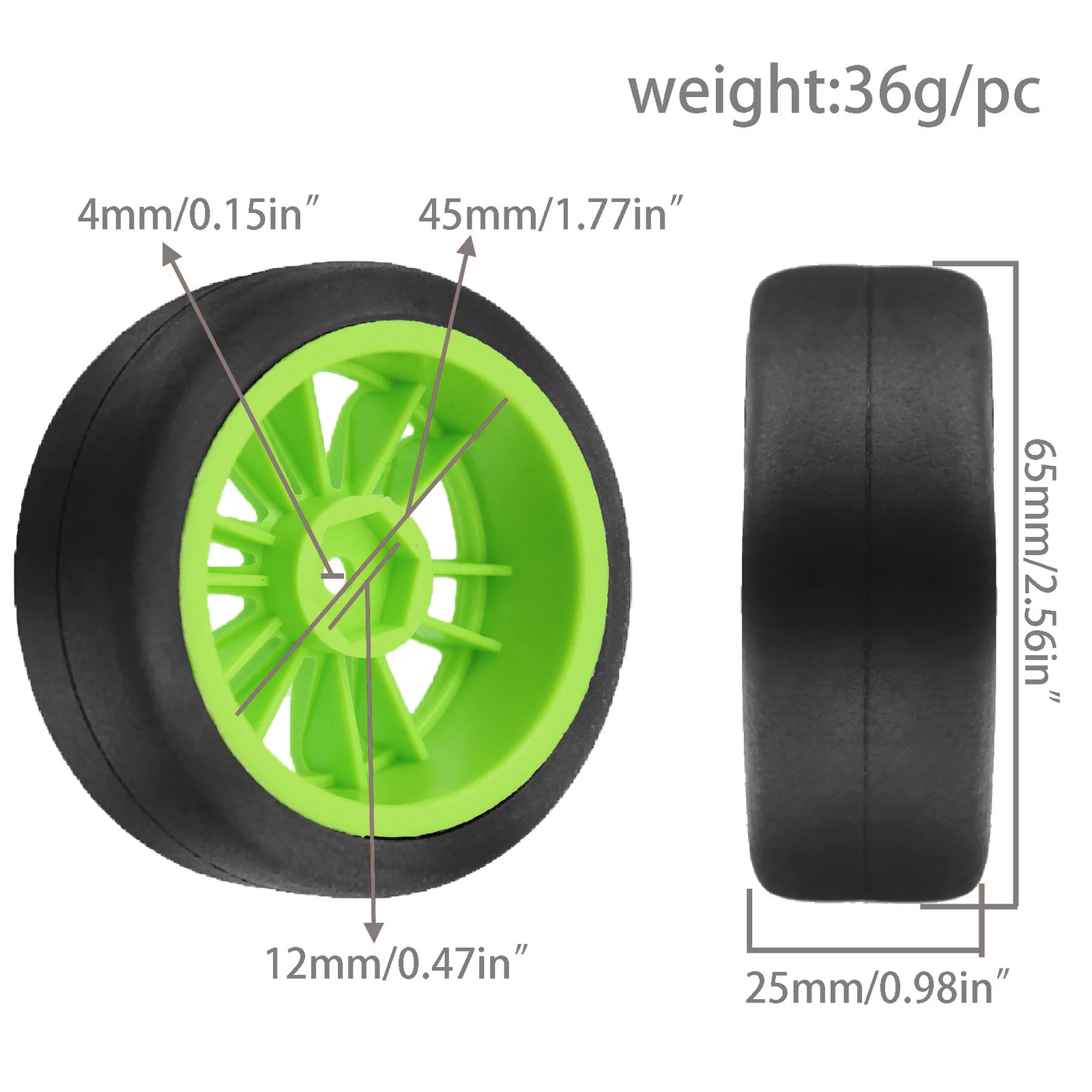 Features: The 1:10 scale tires of 12mm hex are for 1/10 rc drift racing car Tamiya XV01 XV02 TA06 TT01 TT02 PTG2 144001 A959 HPI KYOSHO. This 1/10 rc drift tires of size,Drive Hex:12mm(0.47in);Outer Diameter:68mm(2.68in);inter Diameter:52mm(2.05in);Width:27mm(1.06in); This 1/10 drift car tires designed for rc rally racing car or rc on road racing car.it are designed with special textures, which provide strong anti slip and grip. This 1/10 rc drift tires and wheels is small size easy to replace. The 1/10 rc drift car tires are not pre glued on rims, please clean the joint surface of the rim and tire before gluing.Gluing the tires is also a way for players to experience the fun of rc. Specifications: Rim colour: White or Black Quantity: 4Pcs/set Weight: 153g/set Material: Rubber tires / plastic wheels Width:26mm/1.02in Outside diameter:65mm/2.56in Inter diameter:51mm/2.00in Wheel Drive Hex:12mm/(0.47in) Please make sure our 1/10 rc rally tires and wheels are the correct size you are looking for to avoid returning the product and save you time. Package List: 4 * 1/10 rc drift tires and wheels rims Note: Light shooting and different displays may cause the color of the item in the picture a little different from the real thing. The measurement allowed error is +/- 1-3cm. We highly recommend using the professional tools to mount it, otherwise, the rc rally tyres adapter will be severely worn!