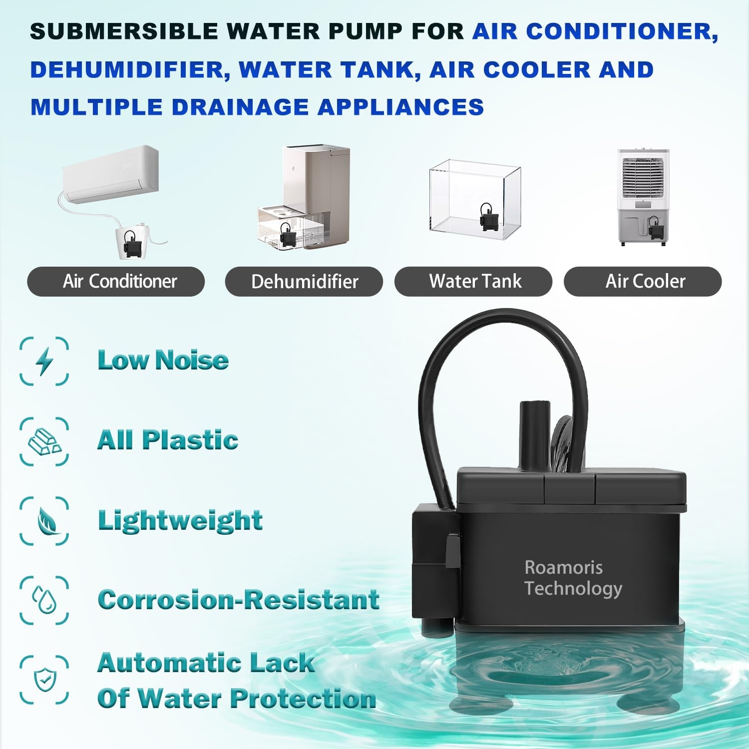 automatic Small Pump with level sensor 【Automatic Water Level Control】The integrated water level sensor ensures automatic operation, preventing water overflow and dry running, providing peace of mind and convenience. 【Small Size】 Our small pump with water level sensor combines space-saving design with efficient liquid handling, perfect for tight spaces,such as air conditioner outer drainage, dehumidifier,air cooler ,HVAC condensate ,furnace and versatile applications. 【Versatile Applications】 From small aquariums and fountains to DIY projects ,fish tank,water-based crafts,and hydroponics our mini pump with a water level sensor adapts effortlessly to a wide range of applications. 【Low Water Level】For the bottom pumping design ,the height of water level as low as 0.5" ,and we recommend the height of the tank is between 4"-20",the max lift height is 3ft. 【Whisper-quiet Operation】Engineered with noise reduction technology, the mini pump operates quietly, providing a tranquil way while efficiently managing water levels. 【Easy Installation and Use】 With simple installation steps and user-friendly controls, our small pump with water level sensor allows for hassle-free setup and operation by anyone.