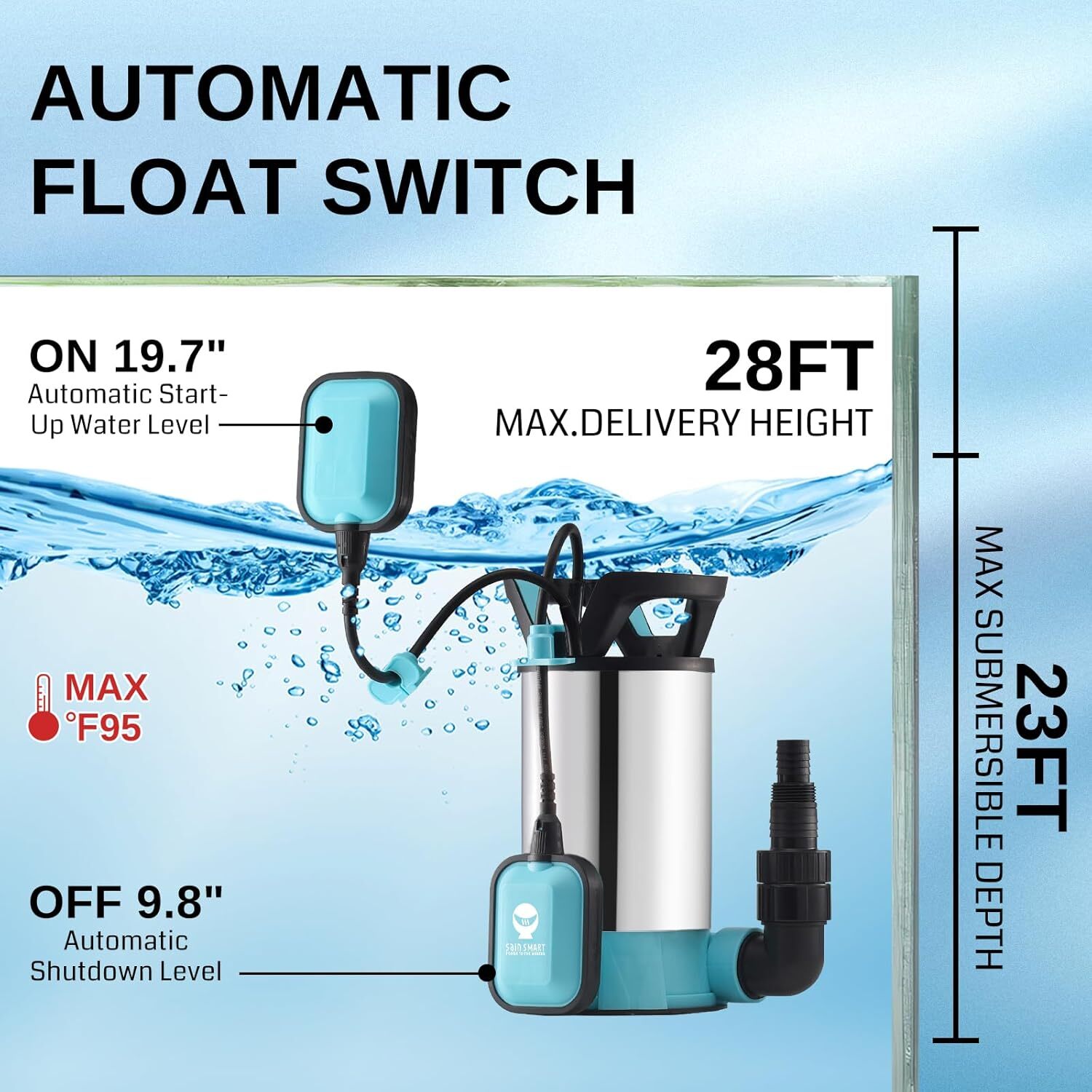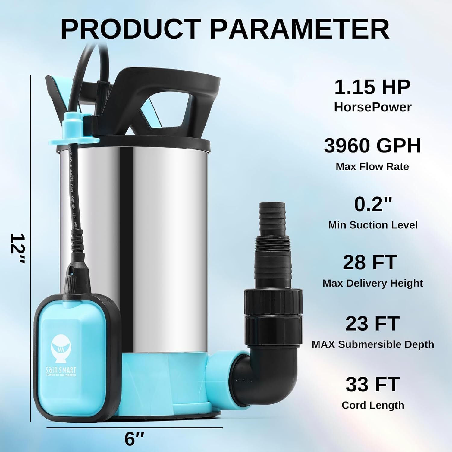 From the brand We try to transform your underwater world into a mesmerizing, hassle-free experience. Filter & Pump Aquarium Gravel Cleaner This is a powerhouse tool designed for comprehensive aquarium maintenance. Submersible Aquarium Heater The temperature control knob and strong suction cups make it easy to use and adjust to your desired temperature. Aquarium Sterilizer UV Light With its supercontact size, our lamp features a 360° shield that protects against harmful ultraviolet radiation. 3PCS Aquarium Filter Sponge Product Description Efficient Filtration and Water Removal The SainSmart portable water pump can handle impurities with particle diameters of up to 35mm, making it perfect for both clean and debris-filled water. Additionally, with a minimum operating water level of just 5mm, it can effectively drain water down to the last drop, Ensuring efficient and thorough water removal in any scenario Stainless Steel Body Our submersible pumps are manufactured from high-quality stainless steel for corrosion and rust resistance and feature an IPX8 waterproof design with premium seals for maximum water protection, protecting the motor for reliable and long-lasting use Portable and Convenient An extended 35FT power cord provides a greater range of use. Unique ergonomic handle and hollow design for easy portability. Compact size and lightweight for easy storage, fits household and outdoor occasions Prevents Backflow The check valve prevents water from flowing back into the pump when it stops operating, ensuring a smooth and efficient drainage process and avoiding potential damage to the pump or system failures caused by backflow What’s in the box: Sump Pump*1 Hose Adapter*3(NPT 1-1/2" GHT 3/4" φ1") Sewage Base Clean water Base