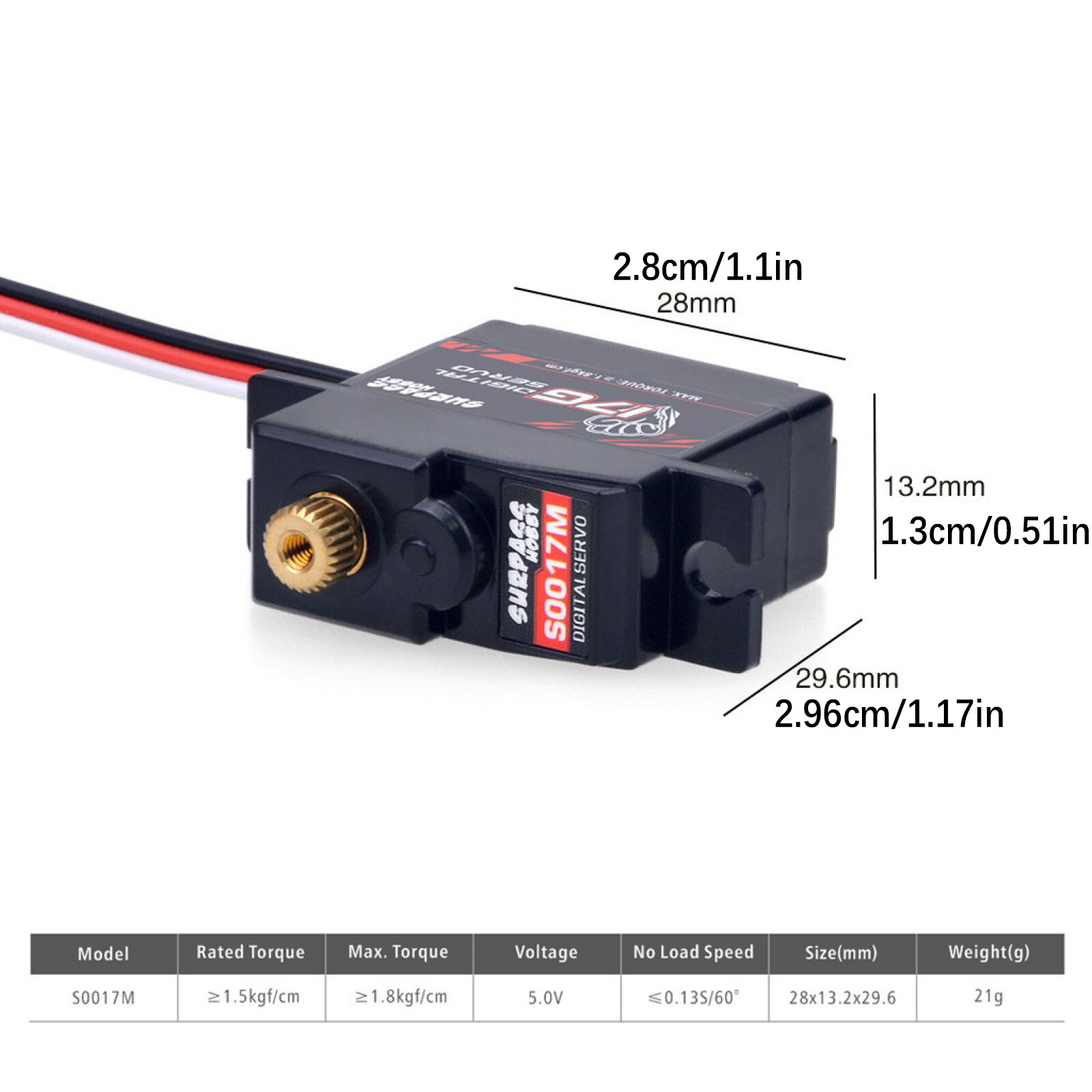 NEW-00023 STORE PAGES You may also like 1:18 RC Plane Boat Car S0017M 17g Metal Gear Digital Servo Replacement Parts i PRODUCT DESCRIPTION Specifications: Model: S0017M Torque: 1.5kgf.cm at 4.8V, 1.8kgf.cm at 6V No load speed: 0.23s/60° at 4.8V; 0.20s/60° at 6V Product weight: 21g (0.74oz) Boundary dimension: 28*13.2*29.6mm (1.1*0.52*1.2 inch) Operating voltage: 4.8V ~ 6VDC Working frequency: 1520 μ s / 333hz Motor type: DC motor Gear type: Metal gear Package includes: 1 x S0017M 17g Metal Gear Servo 1 x Accessory set Shipping Returns Contact Us Payment 1. We ship most of our orders within 24 hours, and may up to 48 hours for. 2. If you want faster shipping way. Please contact us before making payment. 3. Sometimes due to problems with our transportation company system, your shipping information may be delayed to update. We recommend that you try again after 3-4 days. If you still haven't checked the shipping information, you can contact us by ebay message. 1. Always believe we can figure things out with communication, if it comes to return, the pacakge must be intact and the same as you receive. 2. If you have any questions, please feel free to email our service specialists 24 Hours a Day, 7 Days a Week. We will reply you ASAP. 3. Return/refund is accepted within 30 days after the buyer receives the item. NO exchange will be accepted after 30 days from the date when the item is received. 4. Please contact us first before returning your product!!! 1. If you have any questions, our Customer Service staffs welcome you to email us. We strive to answer all questions and resolve any problems as quickly as possible. 2. You can contact us 7*24, we will reply at the first time, and we will surely solve your problems. Note: 1.We try our best to reply to your emails as soon as possible, however, due to high volume of daily incoming emails and time zone difference, we may not be able to reply your emails immediately. Please allow 1 business days for us to response. If you do not receive any reply from us, please check your email ensuring your mailbox has not reached full size. 2.Due to some ISP SPAM filter settings, you may not be able to receive our replies; if you have problems receiving our emails, you may need to use a different email account to contact us. 3.Please give us the opportunity to resolve any problem. We understand the concerns and frustrations you might have, and will try our best to resolve the issues. Please email us before leaving any negative feedback or open any dispute on PayPal. 4.We care about our valued customers, and will always try to help you. So if you have any problems, please e-mail us immediately. 1. We accept all verified payments from ebay. 2. Orders will be shipped after receiving cleared payment. 3. Payment due within 7 days after auction ends and for buy it now listings. Shipping 1. We ship most of our orders within 24 hours, and may up to 48 hours for. 2. If you want faster shipping way. Please contact us before making payment. 3. Sometimes due to problems with our transportation company system, your shipping information may be delayed to update. We recommend that you try again after 3-4 days. If you still haven't checked the shipping information, you can contact us by ebay message. Returns 1. Always believe we can figure things out with communication, if it comes to return, the pacakge must be intact and the same as you receive. 2. If you have any questions, please feel free to email our service specialists 24 Hours a Day, 7 Days a Week. We will reply you ASAP. 3. Return/refund is accepted within 30 days after the buyer receives the item. NO exchange will be accepted after 30 days from the date when the item is received. 4. Please contact us first before returning your product!!! Contact Us 1. If you have any questions, our Customer Service staffs welcome you to email us. We strive to answer all questions and resolve any problems as quickly as possible. 2. You can contact us 7*24, we will reply at the first time, and we will surely solve your problems. Note: 1.We try our best to reply to your emails as soon as possible, however, due to high volume of daily incoming emails and time zone difference, we may not be able to reply your emails immediately. Please allow 1 business days for us to response. If you do not receive any reply from us, please check your email ensuring your mailbox has not reached full size. 2.Due to some ISP SPAM filter settings, you may not be able to receive our replies; if you have problems receiving our emails, you may need to use a different email account to contact us. 3.Please give us the opportunity to resolve any problem. We understand the concerns and frustrations you might have, and will try our best to resolve the issues. Please email us before leaving any negative feedback or open any dispute on PayPal. 4.We care about our valued customers, and will always try to help you. So if you have any problems, please e-mail us immediately. Payment 1. We accept all verified payments from ebay. 2. Orders will be shipped after receiving cleared payment. 3. Payment due within 7 days after auction ends and for buy it now listings. PaymentShippingReturn policyAbout usContact us Copyright © - Tongtool All rights reserved | Design:Tongtool