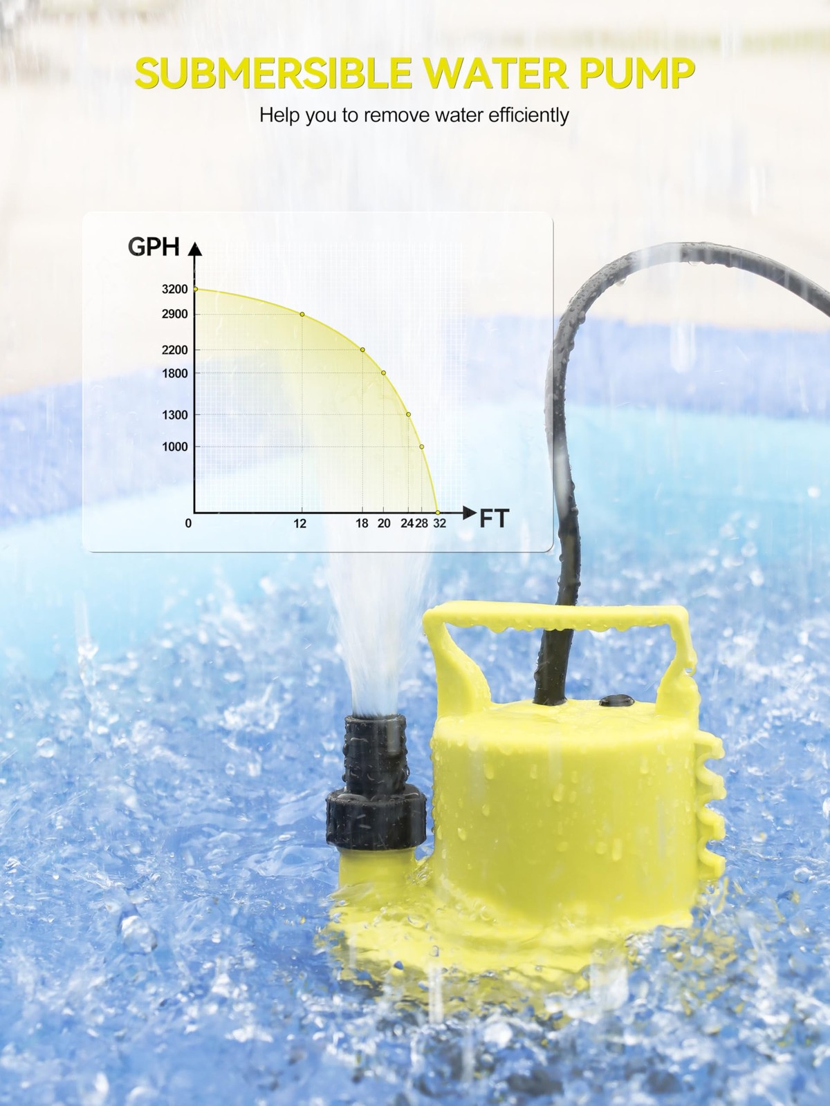 1/2 HP Submersible Water Pump 2900 GPH Portable Sump Pump For Pool, Basements, Puddles, Ponds With 16.4 Ft Power Cord and Hose Adapters, Yellow Efficient Submersible Pump: Submersible sump pump features a 1/2 HP motor, discharges up to 2900 gallons per hour with a max lift of 17 ft and handles solids up to 1/5 inch. PANRANO submersible water pump helps you to complete the draining job easily in a short time Portable Pond Pump: This small sump pump is designed in a portable size, which is 6.5'' in wide and 9.5'' in height. The unique ergonomic handle and 16 ft long power cord allow you to carry and use it in anywhere. After working, you can retract the power cord and place it on the snap on the side of the fuselage, without clutter or occupying too much space Reliable Utility Pump: The corrosion-resistant casing and thermoplastic structure ensure less prone to mechanical failure. Built-in automatic thermal overload protector, which will protect the pump from overheating damage. sump pump has a long service life and can be used for drainage applications for a long time Easy to Use: Comes with a 1" Dia discharge hose adapter and a 3/4" garden hose adapter. You can use different sizes of hoses according to the flow rate. Pump will be directly running when power on. When the water level drops to 1/5 inch, the electric sump pump will continue to run, but it will no longer be able to suck up water Wide Application: Suitable for flushing hot tub, tankless water heater, and removing water from swimming pools, basements or garden ponds, and other flooding areas. Tips: Before using, please submerge the pump into the water at an inclined angle to remove excess air