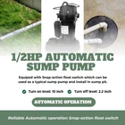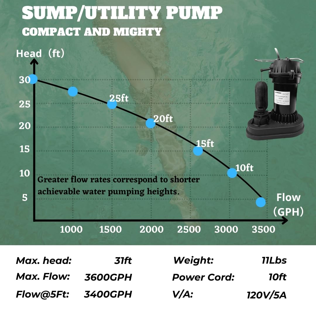 The submersible pump 1/2 horsepower thermoplastic submersible sump pump features a maximum pumping capacity of 3400 GPH to lift water to 31 ft. height. It comes with the vertical float switch for automatic operation. It can be used as a typical sump pump and install in a sump or wet location where drainage collects, and also as a portable utility pump to move water from place to place frequently. POWERFUL SUMP PUMP: The 1/2 HP submersible clean/dirty water pump boasts remarkable performance, effortlessly pumping up to 3400 gallons per hour at a depth of 5 feet. Equipped with a formidable maximum lift capability of 31 feet, it confidently handles even the most challenging water transfer tasks. The pump's robust design allows for a substantial immersion depth, while its lengthy 10ft power cord ensures ample reach for flexible deployment across varied distances. AUTO FLOAT SWITCH: The sump pump, featuring a float switch, functions autonomously in response to fluctuations in water levels. When the water level dips below 2.2 inches, the float switch triggers the pump to automatically cease operation. Conversely, as the water rises to a predetermined start level of 10 inches, the pump springs into action, resuming its water removal duties efficiently. TOP SUCTION DESIGN: The built-in top suction design proficiently prevents air locks and screens out impurities, guaranteeing continuous and uninterrupted pump operation. Coupled with a round, stable base and an enlarged turbine flow passage, this pump excels in confined spaces, making it the perfect choice for regularly pumping small volumes of water with ease and efficiency. Convenient Design: Equipped with three versatile outlet diameters (3/4 inch, 1-1/4 inch, and 1-1/2 inch), this utility pump seamlessly adapts to diverse hose sizes, catering to varying flow rate requirements. Keep in mind, to accommodate greater flow volumes, opting for a wider outlet diameter is crucial. Additionally, this pump boasts a motor integrated with a thermal overload protector, ensuring safety. In the event of the pump stoping operation, it's possible that the protector has been triggered as a safety measure. WIDELY APPLICABLE: The powerful drainage pump tailored for tackling flooded basements, hot tubs, cellars, water tanks, confined crawl spaces, window wells, swimming pools, garden ponds, sump pits, rain barrels, and a wide array of water transfer tasks, ensuring efficient and reliable water removal.