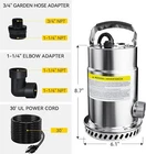 About this item Powerful Motor: Submersible utility pump features an efficient capacitor motor with high flow and low consumption. 1/2HP motor can move up to 2820GPH at 5ft and lift water up to 24.5ft vertically, perfect for hot tub and basement drainage. It can also transfer clean water for garden irrigation. Durable & Handy: Quilty stainless steel housing with high-performance impeller ensures corrosion resistance and durability. Carrying handle and 30ft UL power cord for portability and convenience. 1-1/4’’ discharge with 3/4’’ garden hose adapter & 1-1/4’’ elbow adapter, easy to install. Safe & Simple Operation: Built-in thermal overload protection prevents the motor from overheating and burning. Internal air relief valve prevents airlocks. 100% factory tested. Manual electric water pump is easy to operate. Plug and play. Oil-free Design: The small sump pump is eco-friendly and safe for aquatic life. Premium mechanical seal and bearing ensure low noise and long service life. Removable suction strainer filters out debris, easy to clean and maintain. Fully immerse the pump before startup and prevent it from freezing in winter. Wide Applications: This residential/light commercial duty pump is ideal for draining water from flooded basements, aquariums, rain barrels, window wells, hot tubs, pool covers, crawlspace, ponds, and general water transfer. TWO-YEAR warranty keeps your water system stable and worry-free. Acquaer customer service provides professional advice on installation and maintenance.
