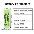 1.2V NiMH AA Rechargeable Batteries 700mAh, 12 Counts Double A pre charged battery for Solar Lights, String Lights Pathway Lights,Mouse, Keyboard 【Strong Performance for Solar Lights】Dimension: Height 50mm,Diameter 14.2mm;AA solar batteries 700mah NiMH material, which can lasting super long time than other smaller capacity batteries 【Money-Saving】The rechargeable AA 700MAH batteries can be constantly recharged 1200 times, saving you money on purchasing one-time use disposable alkaline batteries 【Wide Temperature】 The 1.2V AA Nickel Metal Hydride nimh rechargeable batteries 700 mah use best cell and strict quality control can keep stable and reliable performance in a wide temperature rang from -40℉ to 140℉ 【High Performance】1.2V NiMH AA 700mAh rechargeable batteries have a capacity of 700mAh and can be recharged at least 500 times continuously and reduce the harm to the environment 【Widely used】Can be widely used for battery string lights, landscape lights, lawn lights, toys, TV remotes, flashlights, wireless mouses,smart home devices, digital cameras