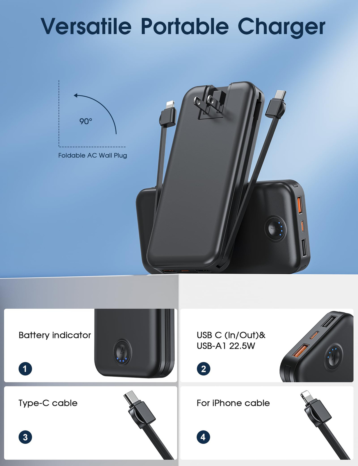 Portable Power Bank Comprehensive: This charging bank built-in USB C and for iPhone cables, top up your iPhone Android cell phones easily. The AC Wall plug allows you to recharge the portable charger directly from 100-240V wall socket, no need extra adapter, cords wherever you go. Powerful and Compact: The 12000mAh large capacity can provide 2.2 charges for iPhone 11 Max, 1.6 charges for Google Pixel 7 , 1 charge for 12.9" . Battery pack dimension is 5.90 x 2.66 x 0.78 in, lightweight 0.50 Lb, convenient to take with and would not be a burden for you. Super Fast Charging: External charger has USB-A and 1 USB C ports, capable charge 5 devices sync. The USB-A1 give 22.5W high speed delivering, charge for iPhone 12 from 0% to 75% in 30 minutes, USB C refill Google Pixel 6 to 55% within 45 minutes by the 20W power. Steady Recharge: Need 5 hours to charge through wall and just need 3.5 hours by the 20W above fast charge cord, all-around intelligent chip protect the battery bank from short circuit, over charging, regardless of which way you choose, you can keep the power pack full of energy all the daily life. Packing List: 1x 12000mAh portable charger, 1x Type-C charge cord, 1x user manual, we have promptly 7 Day/ 24H friendly , please don’t hesitate to us if you have any questions, we will solve it within 12H, have a pleasant outdoor activity or travel with our portable battery charger.