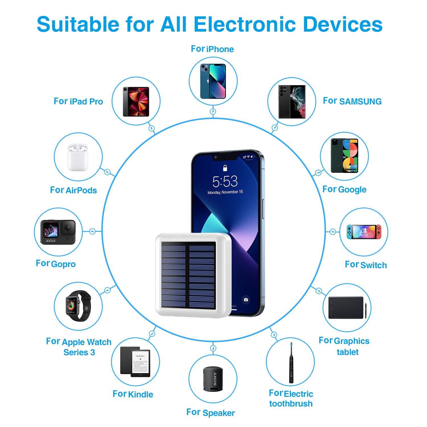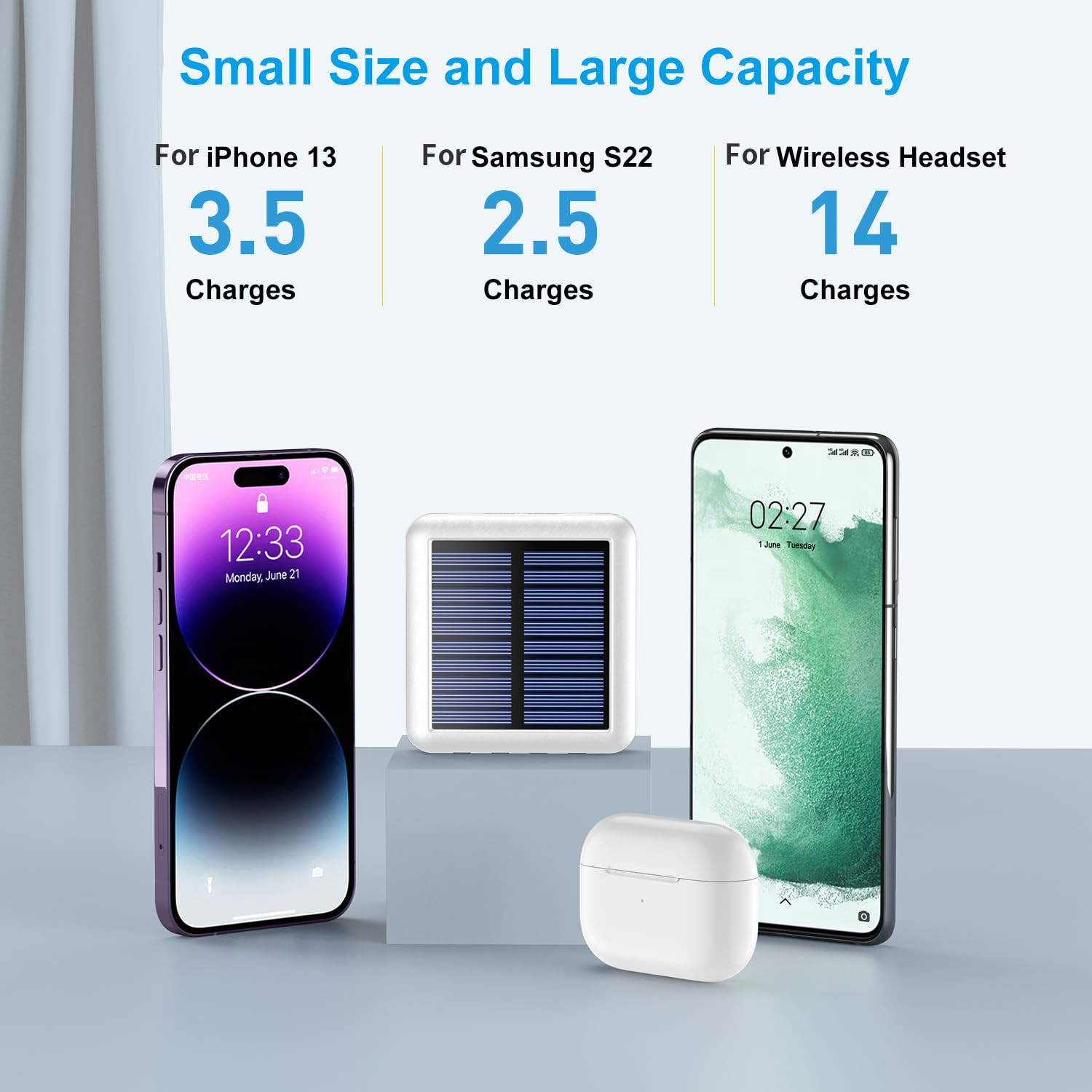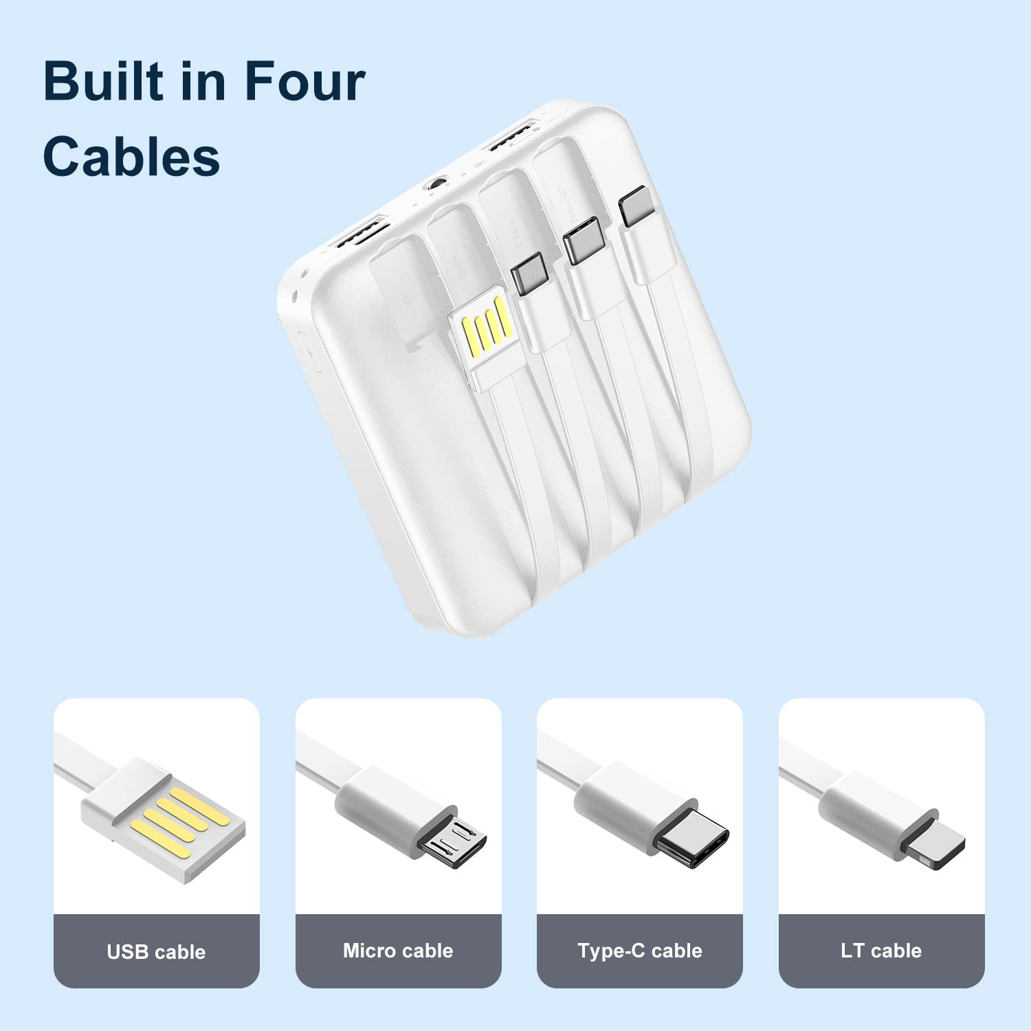 【Super Mini】One of the smallest and lightest 12000mAh solar power bank. only 3*3.2*0.8 inch,it's easy to put in your pocket or bag,lanyard design is easy to carry. 【4 Cables+2 USB Outputs】It can charge 5 devices simultaneously. Compatible with all smart phones,tablet and other USB devices.Solar power bank provides more convenience in your daily or in your trip(The charging bank supports charging of iPhone15 series mobile phones). 【Two Charging Way】External battery charger with solar panel can recharge by solar or outlet. In daily life, we recommend to charge it by adapter, take the solar charging as the emergency backup solution. 【LED Light and Battery Indicator】Led lights can be used as flashlight . Five pilot indicators show the status of the battery charger timely. The Solar pilot indicators light on when charging by a,Hold down the on button for 4 seconds and the flashlight will work. 【Best Warranty and What You Get】12 months Warranty, 24h online after-sales service, Friendly replace policy. Any related issues are guaranteed with friendly REPLACEMENT or REFUND, and also.