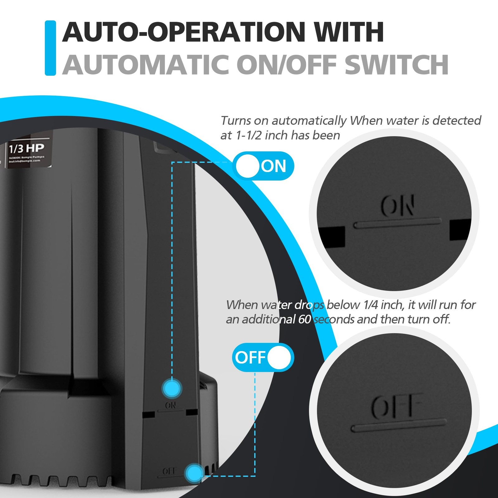 This pump is a game-changer! It kicks on automatically when water hits 1.5 inches and shuts off after draining down to 1/4 inch, running an extra minute to clear everything. The 1/3 HP motor moves an impressive 2250 GPH, making quick work of pool covers, basements, or hot tubs. Love that it handles dirty water too—perfect for outdoor jobs. Super reliable and powerful for its size!