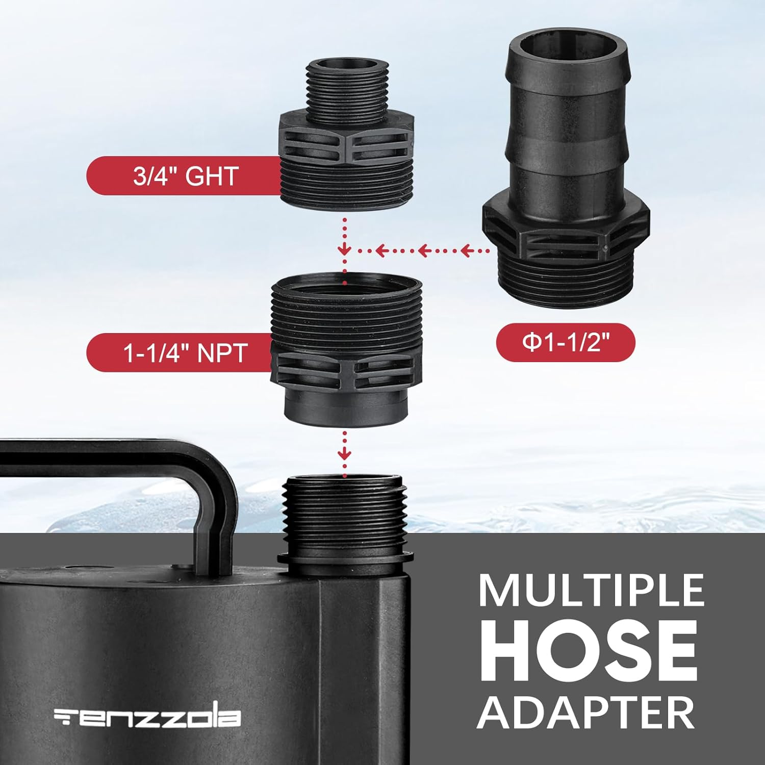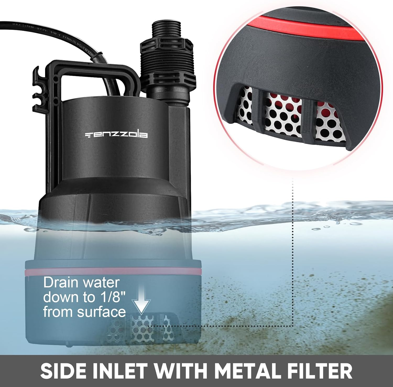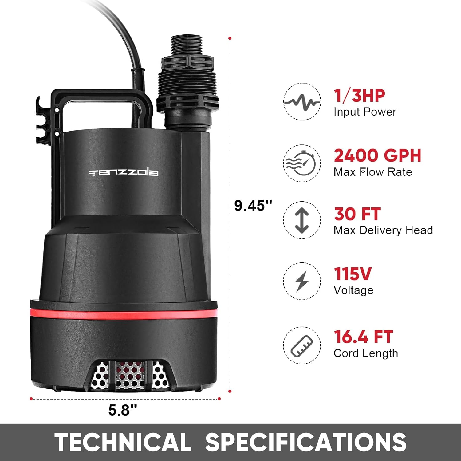 Efficient Sump Pump: Tenzzola submersible water pump features a powerful 1/3HP motor, capable of draining up to 2400GPH and lifting water up to 30ft vertically. Constructed from durable thermoplastic material, this sump pump is built to last with enhanced corrosion resistance. Designed for durability: The side inlet at the bottom of the submersible sump pump prevents the suction of debris and sediment from the bottom, while the metal filter blocks impurities like small stones, protecting the pump’s internal components for longer-lasting performance. High-strength impeller and high-quality sealing ensure a long service life Easy to Use: This submersible pump features a 1" discharge and includes a multi-use hose adapter compatible with 3/4" GHT, 1-1/4" NPT, and 1-1/2" barbed fittings for versatile connections. The pump efficiently operates until the water level drops below 1/8 inch. Versatile Application: Easily operate this utility pump by plugging it into the power supply. Suitable for pool draining, basements, ponds, pits, rain barrels, flushing hot tubs, tankless water heaters or other flooded areas. It’s also perfect for irrigation, garden watering, car washing, and various other home needs Customer Service: Tenzzola water pump is a dependable solution for water management. We prioritize customer satisfaction with exceptional after-sales support, available 24/7 to address any questions or concerns. Additionally, this product comes with a 12-month warranty for your peace of mind Product Description