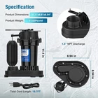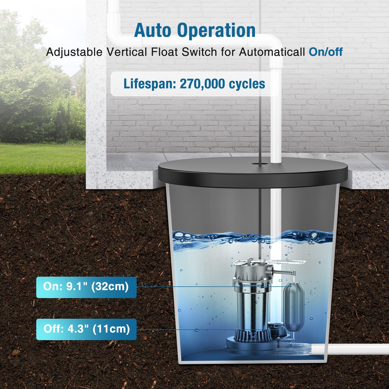 FEATURES: 1. Efficient 1/3 HP Motor: Powered by a robust 400W pure copper motor, Crestwave submersible water pump can achieve an impressive flow rate of up to 3400 GPH and a vertical lift of 25 feet, making it ideal for residential and commercial drainage applications 2. Integrated Vertical Float Switch: Equipped with a durable vertical float switch that’s UL certified and tested to 270,000 cycles, this pump automatically adjusts with water levels, offering reliable, hands-free operation to prevent overflow 3. Corrosion-Resistant Aluminum Casting: The aluminum-cast housing construction provide enhanced corrosion resistance and durability, ensuring long-lasting performance even in harsh conditions 4. High Durability and Safety Features: The oil-filled motor and dual oil seals with a mechanical seal ensure efficient, low-temperature operation with a 1500-hour lifetime, while the thermal protection feature prevents overheating for safe, continuous use 5. Easy Installation and Versatile Use: Comes with a 6-meter (19.7 ft) green nylon rope and a 3-meter (9.8 ft) power cord for flexible setup. The 1-1/2” NPT discharge meets building code standards, allowing compatibility with standard hoses and quick installation for reliable drainage Package included: 1 x 3-meter (9.8 ft) power cord, 1 x 1/3 HP Aluminum-Cast Sump Pump 1 x 6-meter (19.7 ft) green nylon rope