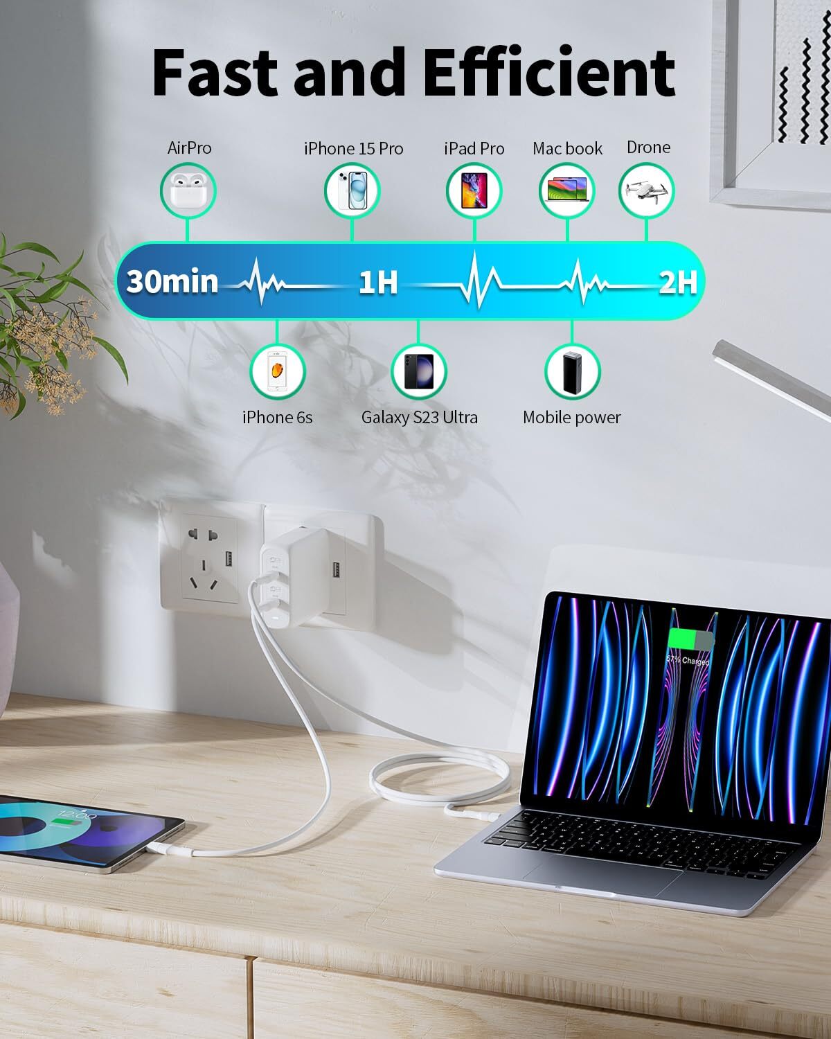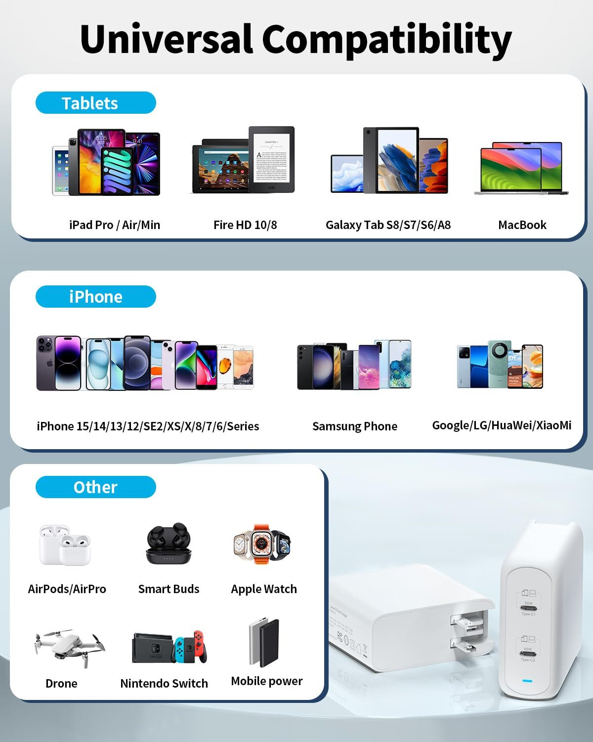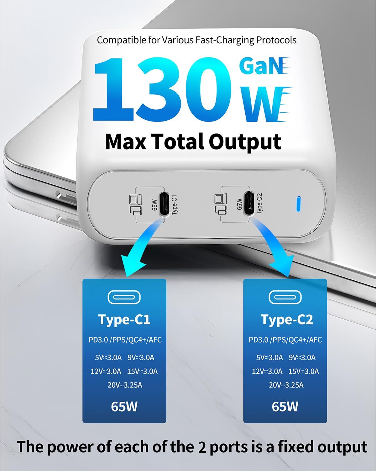 【2-in-1 USB C Charger】This 130W charging station has 2 tyce-c fixed 65W power ports, which can provide fast charging for 2 different devices at the same time. The C1 or C2 port charges iPhone 14 from 0% to 50% in just 20 minutes. 【2-in-1 USB C Charger】This 130W charging station has 2 tyce-c fixed 65W power ports, which can provide fast charging for 2 different devices at the same time. The C1 or C2 port charges iPhone 14 from 0% to 50% in just 20 minutes 【Safe Charging】Our 130w USB c fast charger has passed CE, FCC, UL certification and complies with safety standards. It integrates a comprehensive protection function design such as overvoltage, overcharge, overcurrent, overload, surge and short circuit 【Wide Compatibility】usb type c charger supports various fast charging protocols such as PD 3.0, QC 3.0, AFC, FCP, SCP, PPS. Compatible with a range of devices, including Galaxy S23/S22 Ultra, iPhone 15/14 Pro, MacBook Pro/Air ect 【Compact and Portable】The foldable and compact design of the 130w 2-port USB C charger can save you more than 50% space, can replace two 65W high-power chargers, and can be easily put into pockets, handbags and travel cases 【What You Get】130W usb c wall charger block, The product is backed by a worry-free 12-month warranty and 24-hour friendly customer service. If you have any questions or concerns, please feel free to contact us