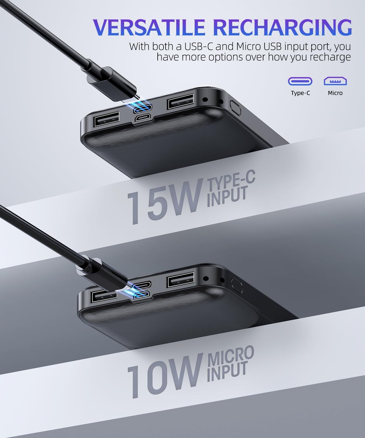 Portable-Charger-Power-Bank - 2 Pack 15000mAh Dual USB Power Bank Output 5V3.... PRODUCT DESCRIPTION PRODUCT FEATURES Power bank is equipped with USB-C and Micro USB input ports, which can fully recharge itself in just 4-5 hours at 5V 2.0A.(Note: Type-C port can only input, does not support output) . Its portable design allows you to stay connected without being tethered to a wall socket, providing convenience and freedom wherever you go. Portable charger with its 5V 3.1A dual USB output ports, that has the ability to fast charge two devices simultaneously. Introducing a compact and powerful that will rid you of any worries about your phone's battery life. Whether you're traveling or simply at home, this charger is your perfect companion. Portable charger has an impressive 15000mAh ultra-high capacity, can provide you with an excellent battery life experience. No more worrying about your phone running out of juice during outdoor activities like hiking. Enjoy a worry-free and wonderful trip with this reliable companion. Power bank utilizes a safe high-density lithium polymer battery module because safety is our utmost priority . Not only is it more compact, but it also offers a larger battery capacity, surpassing traditional lithium-ion batteries in safety standards. Your satisfaction and safety are our primary concerns, ensuring a positive shopping experience for you. Portable charger Features an intelligent controlling IC, can automatically identify and provide universal compatibility with all devices. It intelligently adjusts the current and voltage to suit each device, effectively preventing overcharging, overvoltage, overcurrent, and short circuits. This ensures a safe and stable charging experience, say hello to worry-free charging. π SHIPPING We offer fast and reliable shipping. Your order will be processed within 1-2 business days. International shipping is available to most countries. All items are securely packaged to ensure safe delivery. π RETURNS If you are not satisfied with your purchase, you can return it within 30 days for a full refund. Refunds will be processed to your original method of payment. Items must be returned in their original condition and packaging. π³ PAYMENT We accept payment via PayPal, credit cards, and other payment methods supported by eBay. Please ensure your payment method is correct and updated to avoid any delays in processing your order. β FEEDBACK We value your feedback. If you are happy with your purchase, please leave us a positive review. π CONTACT US If you have any questions or need further assistance, please feel free to contact us through eBay messages.
