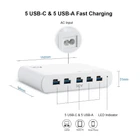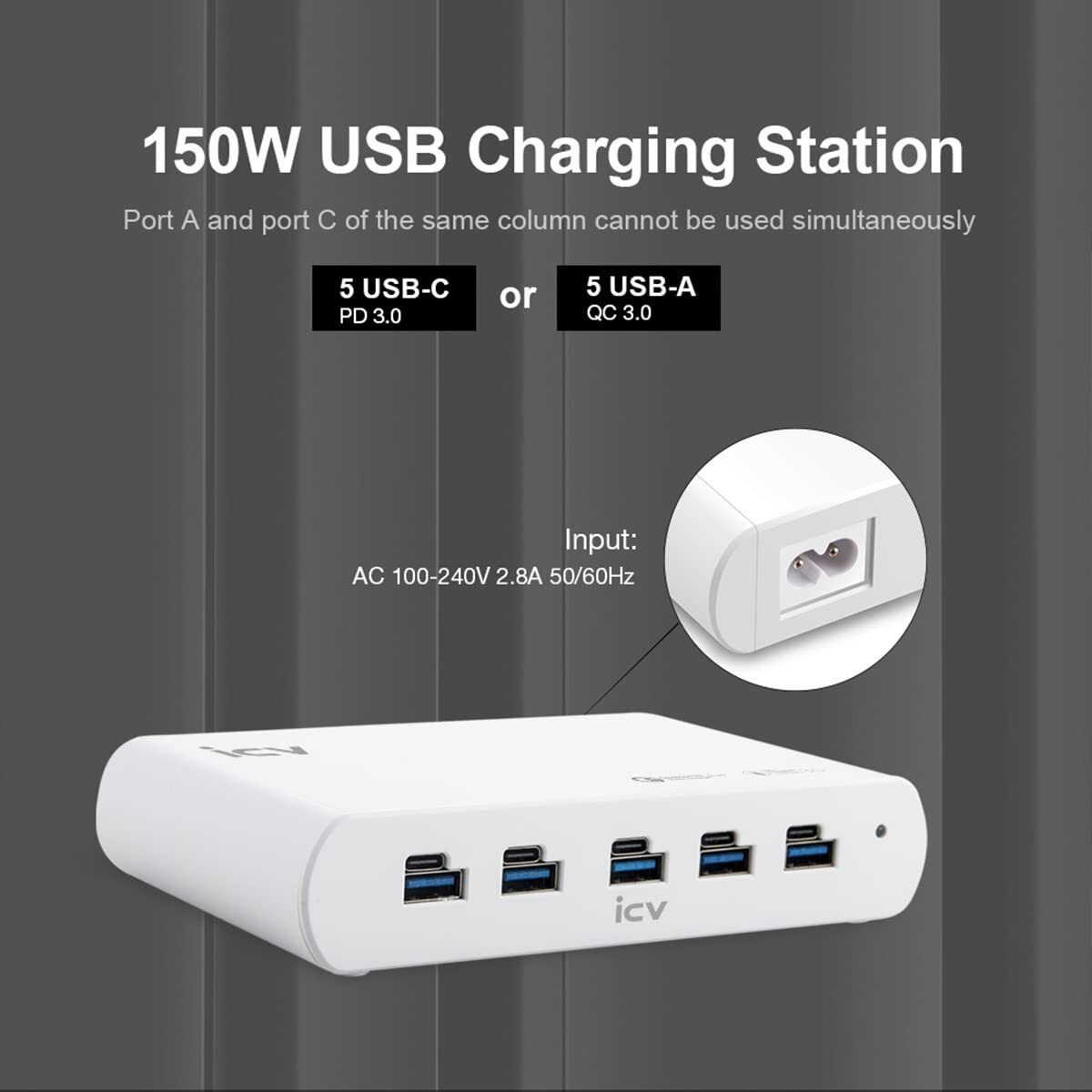 Performance of 150W GAN PD Fast Desktop Charger Station Input: AC 100-240V 50/60Hz 2.8a USB-C Output: DC 5V3A/9V3A/12V3A/15V3A/20V5A max USB-A Output: DC 5-20V 3A Max Total power: 150W MAX Use for most USB TYPE-C laptop, tablet PC, cellphone, earphone and more. Up to 5 devices can be charged Simultaneously: High-speed PD charger for iphones, ipads, Macbook, android phones tablets laptops devices. Very suitable for desktop multi devices charging, widely used in homes, offices, schools, hospitals and more. Greener with GaN: If every household used our GaN products in place of non-GaN products, the amount of power saved could be up to 800 million kWh per year. This charging station had passed the UL standard. Built in multi protection systems, high quality microchips, premium components ensure complete protection for you and your devices. VERY IMPORTANT: Adjacent A and C ports cannot be used simultaneously. If using port C, the adjacent A port cannot be used simultaneously; If using port A, the adjacent C port cannot be used simultaneously. PLEASE NOTE THIS. Innovative Technology Built-in:PD3.0, Quick Charge 4/3, PPS Protocol etc. All advanced charging technology are designed for the product to support different charging function. Compatible with iPhone 15 14 13 12 11 Pro Max / XS XR X 8 7 6 Plus/ Galaxy S22 S21 Ultra / S20 + / S10 + , iPad Pro 12.9 / 11 / 10.5 / mini 7.9, Google Pixelbook, MateBook X Pro / 13; Notebook 9 (950XBE). Laptop compatible with MacBook Pro Air12 13, HP Spectre X360 Lenovo and More. What You Get: 1 x 150W GaN USB desktop charger, 1 x 4.7ft white AC Cable, 1 x 3.9ft white USB C to C cable, 1 x User Manual, 12 month warranty and friendly customer service.