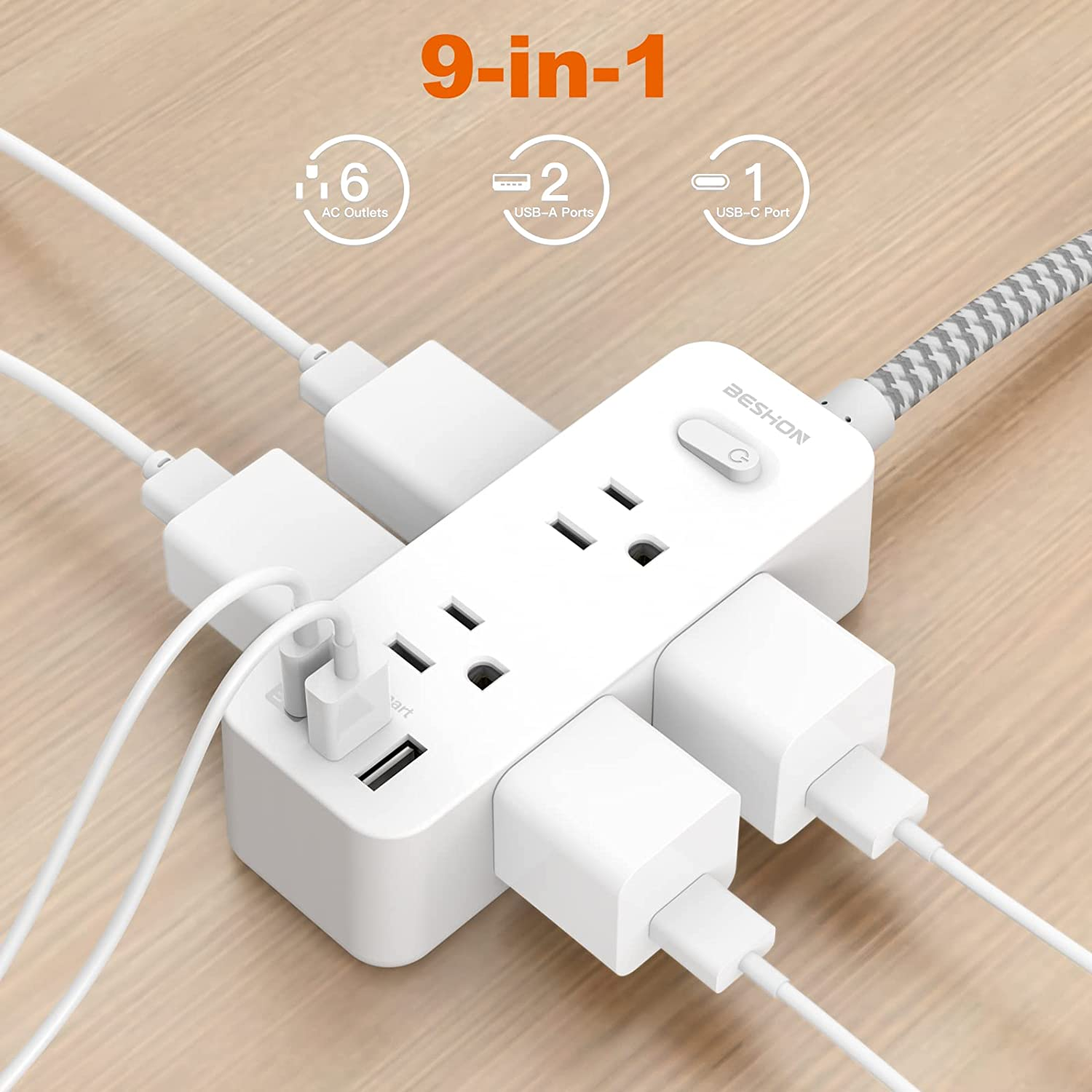 Store New Arrivals Add to Favorite View Feedback Contact 15Ft Extension Cord, Power Strip Surge Protector, 6 Outlets with 3 USB Ports(1 USB C Outlet), 3-Side Outlet Extender, Wall Mount, Compact for Home, School, College Dorm Room Description Item model number BS6W3T Color White Product Dimensions 5 x 1.9 x 0.04 inches Country of Origin China Item Weight 1.21 pounds Total Power Outlets 6 Voltage 125 Special Feature Surge Protection Size 15FT-Right Angle Plug 【15 FT Long Extension Cord】 This long power strip with 15ft is long enough to make it more flexible, flat plug design indoor extension cord with USB can fit easily in tight spaces, such as a desk, or nightstand; 45 degrees right-angle create enough room makes this USB power strip flat plug does not obstruct other plugs, suitable for installing behind sofa, wardrobe, bookshelves, and other furniture 【9 IN 1 Power Strip with USB-C】3-side power strip with 6 AC outlets and 3 USB ports can power up 9 devices simultaneously. Compatible with almost all USB devices(the actual current is decided by the demand for the devices) 【3 Side Design & Wide Space Outlets】3-side design that makes it enough to fit big adapters and suitable for all kinds of equipment. and each AC outlet with 1.6 inches of space in between, is larger than a standard 1.5-inch socket. fit big adapters without blocking each other. The compact design saves more space, suitable for travel, home, dorm room, and office 【Surge Protection & Overload Protection】900 Joules surge protector with overload protection protects your electrical appliances from lighting, surges, or spikes. 【USB-C FAST Charge】3 USB ports total 5V/3.1A TOTAL, Each USB-A port provides 5V/2.4A max, and the USB-C port can up to 5V/3A max. Built-in smart charging technology that detects and delivers the fastest possible charge speed up to 5V/2.4A per port. Product Description Want to find a power strip meets your different needs? BESHON USB Smart Power Strip with 6 wide outlets & 3 smart USB charging ports allows you to make reasonable use of the socket. It makes up little space on your desk or floor and makes your desktop organized, and suitable for home and office. Surge protector can protect your devices from lighting, surges or spikes. Overload protection switch will trip off automatically to protect your devices and your home when power overload. 15FT Extension Cord, The power cord is very thick and has better current carrying capacity, and the braided extension cord is not easy to deform, durable and more safety than other power cord. Unique Multi Sides Design AC outlet with 1.6 inches of space in between, is larger than a standard 1.5-inch socket. fit big adapters without blocking each other. The compact design saves more space, suitable for the travel, home, dorm room, and office Right Angle Flat Plug The 45-degree angled design doesn’t block the bottom receptacle of your duplex wall outlet Wall Mountable Power Strip Two holes on back allow you install this power strip on different applications. Specification Rating: 125V 60HZ 15A Maximum Power: 1875W MAX Surge Protector Rating: 900 joules USB OUTPUT: 5V3.1A TOTAL USB C OUTPUT: 5V 3A MAX Length of Cable: 15FT ABOUT US We offer the best prices around on high quality products. Our E-store includes media such as books, movies, music and games while offering electronics, toys, sporting apparel, clothing, tools, general home, garden items and more. SHIPPING We are always working hard to ensure your package arrives as soon as possible. Please understand that some factors like weather, high postal traffic, and the performance of shipping companies are outside of our control. We offer free shipping to the lower 48 states and ship within 2 business days of payment, usually sooner. We do not accept P.O. Boxes. Please provide a physical address. For shipping outside of the continental USA, we only use eBay's Global Shipping Program.The item is shipped to KY and then sent to the rest of the world. International customers are responsible for all duties and taxes. Continue to check out in order to calculate costs for shipping the item to your country. Messages regarding eBay's Global Shipping Program MUST be directed at eBay EXCLUSIVELY. RETURNS We offer a 30-Day Return Policy on items which you are not completely satisfied with. You have the option for a full-refund or an exchange of the item. No returns are available on items shipped outside of the USA. PAYMENT We accept PayPal. CONTACT US This page content is yet to come Please ad us to your favorite seller and visit again later Thank You CUSTOMER SATISFACTION We try our very best to make sure every customer is completely satisfied. If there's a problem, message us! We're happy to help. WE ACCEPT Copyright © 2021 AutoDS. | All Rights Reserved