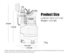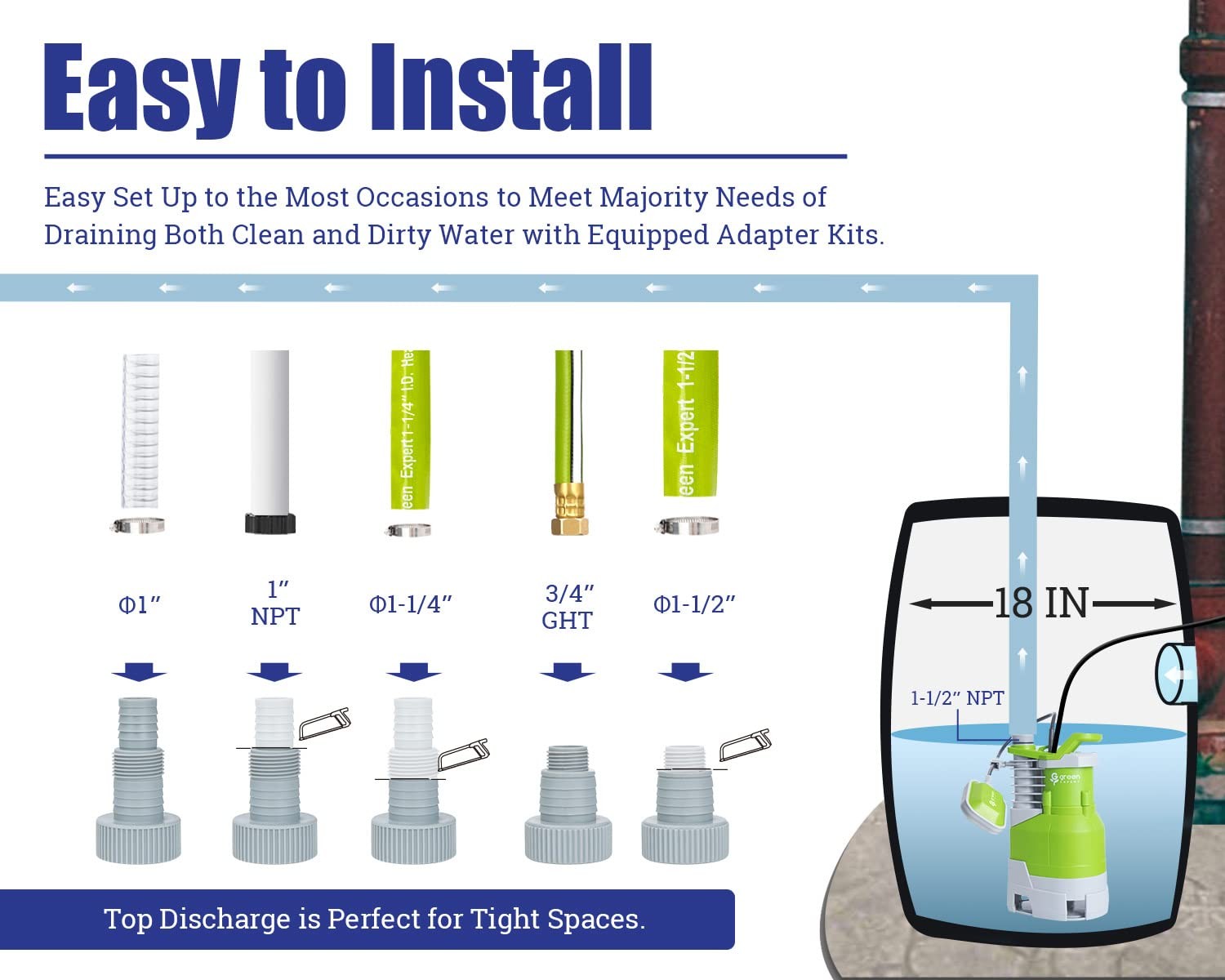 Product Details Green expert 1.5 horse power submersible sump pump with tethered float switch for water transferring automatically. Automatic on/off tethered float switch for continual operation by water level. It works at 12 inch deep water until the water down to 1.5 inch depth. It features a maximum pumping capacity of 5000 GPH for dependable efficiency with low consumption and can maximally lift water to 33 feet height. The lengthened 25ft power cable allows you to connect to the power conveniently. This item is designed for common 115V, 60Hz. 7.2 amps full load motor with thermal protector for safety use. Application Occasions This Submersible Sump Pump with high flow is recommended for use in basins or household water draining and transferring, and is suitable for pumping clean/dirty water of max 1-1/3 inch diameter solid in any enclosing environment, such as cellars, flooded basements, hot tub spas, pools, ponds and more. Specification Output power: 1.5 HP Motor full load: 7.2 amps Max height: 33 feet Max Flow: 5000 GPH Max fluid temperature: 95 ℉ Max. submersible depth: 20 feet Length of cable: 25 feet C(UL)16AWGX3C Diameter of pipe: 1", 1-1/2", 3/4" Lowest pump sucking level: 2” Lowest pump working level for long time use: 5.5” Package includes 1 x Submersible sump pump 2 x hose adapter 1 x detailed manual Warranty We provide a 1-year limited warranty for this item from date of purchase. 【Powerful Sump Pump】High performance PSC motor with thermal overload protection produces great 1.5HP output power for increased reliability and longer motor life. Pump has the ability to lift water up to Max. 33 feet of vertical height; Removes water up to 5000 gallons per hour at zero feet, 68.5 gallons per minute at 10 ft of discharge lift. 【Adjustable Float Switch】Buckle design of float switch can keep the floater uplifted for permanently working until plug off, or clamp to pump body for stable ON/OFF operating automatically. Designed for quickly draining both clean/dirty water from flooded house, basement, sumps, window wells, water tanks, pools, cisterns, hot tub spas, and flooding in low lying areas. 【Green and Tough Design】Environmental and ergonomics appearance can comfortably fit in your house and garden, quiet running. Full corrosion-resistant and reinforced thermoplastic construction with thermal overload protection for continuous duty use in water removal application. 【Easy Attach to Hose Kit】Comes with two plastic adapters: 1”&1-1/2" connect discharge hoses for high capacity pumping; 3/4" GHT&1-1/2" NPT connect threaded hoses for quickly installation. *Expandable garden hose is NOT recommended since pump would lose 85% pressure to expand hose before pumping out water that results low flow. 【Portable and Convenient to Use】Carrying handle and 25 foot grounded waterproof cord allows convenient installation from farther position. Top discharge design comes smaller installation space. 【Safety Guarantee and Customer First】Follows UL 778 standard for safety and 100% manufacturer tested. For any question, please don't hesitate to write to us through our storefront and click "ask a question", or support email to us, we will respond within 24 hours.