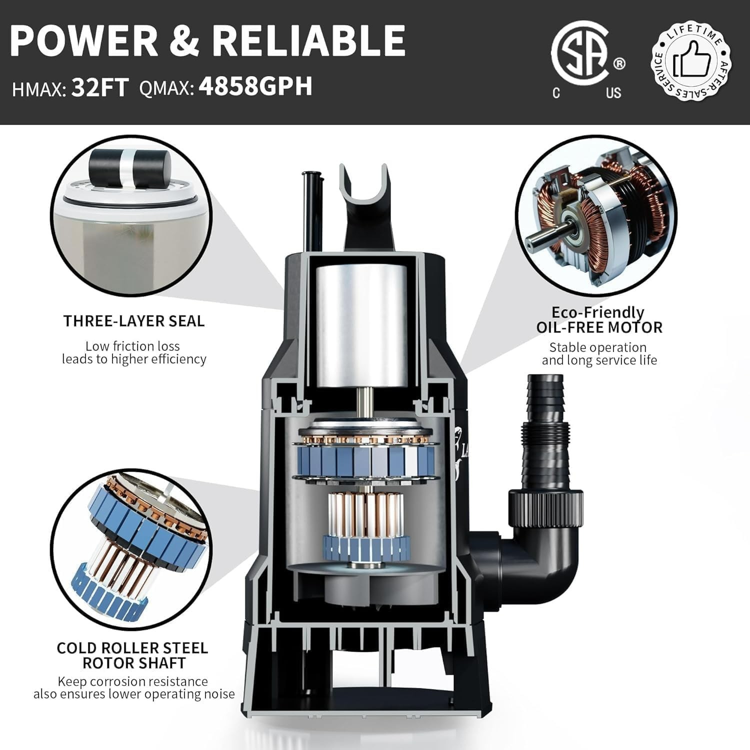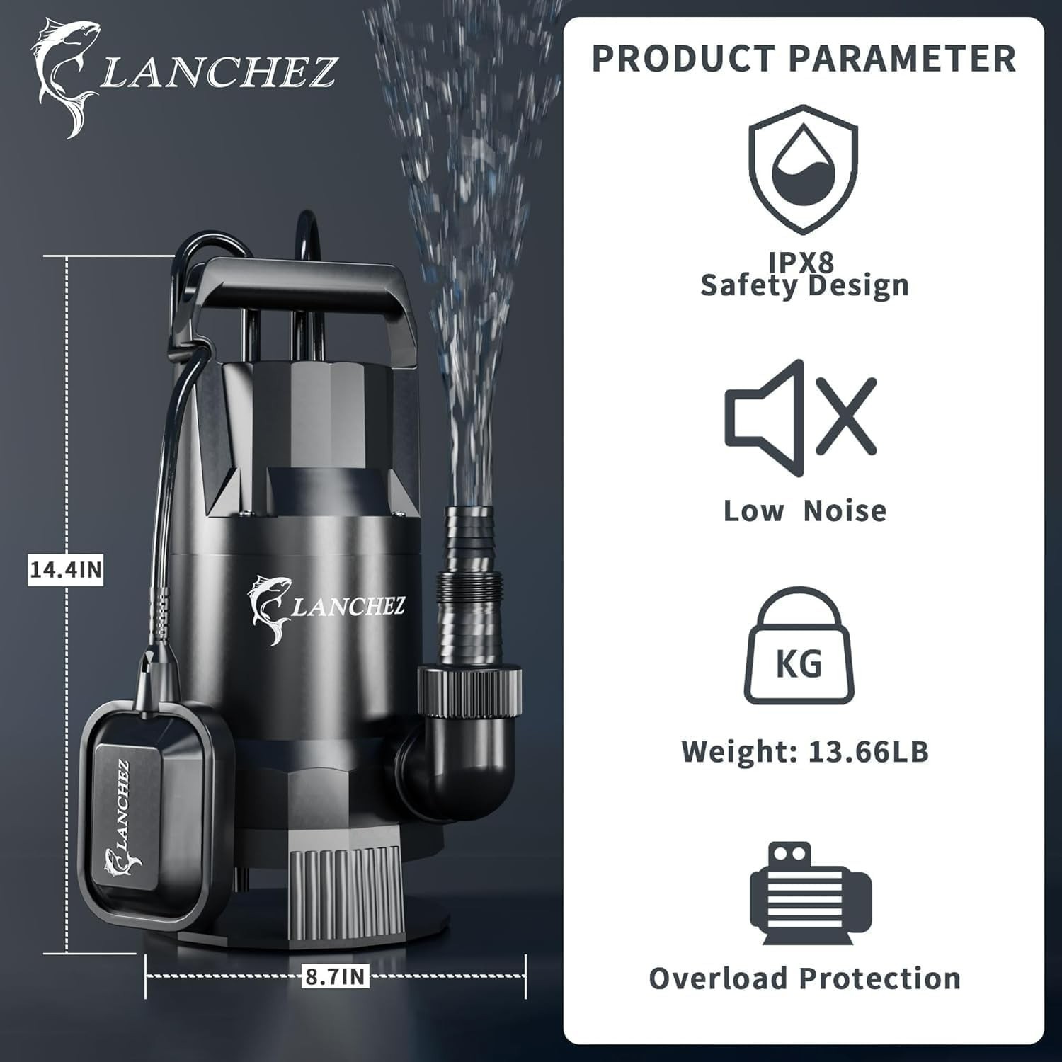 Bomba De Agua 1.6 HP Sumergible Para Pozo Acero Inoxidable 207 FT 33 GPM 110V About this item: 【Efficient Sump Pump】LANCHEZ submersible water pump with 1.6 HP motor to ensure sufficient power both reduced more energy efficient and noice. Discharge water up to 4858 GPH(81 GPM), lift water up to 32 ft vertical height. High baseplate design for particle passage up to 1.37 in, say goodbye to draining woes, easily adapts to sewage environments 【Easy to Use】Automatic float switch, body with no button design, just drop the pump in the water and plug it in, and the float switch can control on and off with rises and lowers with the water level. Constructed with a high quality and impact resistant thermoplastic casing, which makes it robust and corrosion resistant. Built-in automatic thermal overload could protect the water pump from damage for work for continuous work 【Good Compatibility】The convenient handle on the top makes it easy to carry it around. NPT 1-1/2" discharge comes 3/4'' NPT garden hose adapter, 1-1/2'' NPT elbow adapter and multi-hose adapter, easy to accommodate several hose sizes. And equipped with 16 ft power cable, it can be used in a wide range of applications without the need for an extension cord 【Wide Application】Submersible pump with IPX8 waterproof and PA66 material impeller, suitable for hot tub, water tank, and remove water from swimming pool, standing water in basement, cellar or sump pit, rain barrel, and other flooded areas 【Tips】Before using the pump, submerge this pump into the water at an inclined angle to remove excess air. Support automatic start/stop, and attention to float switch activation requirements