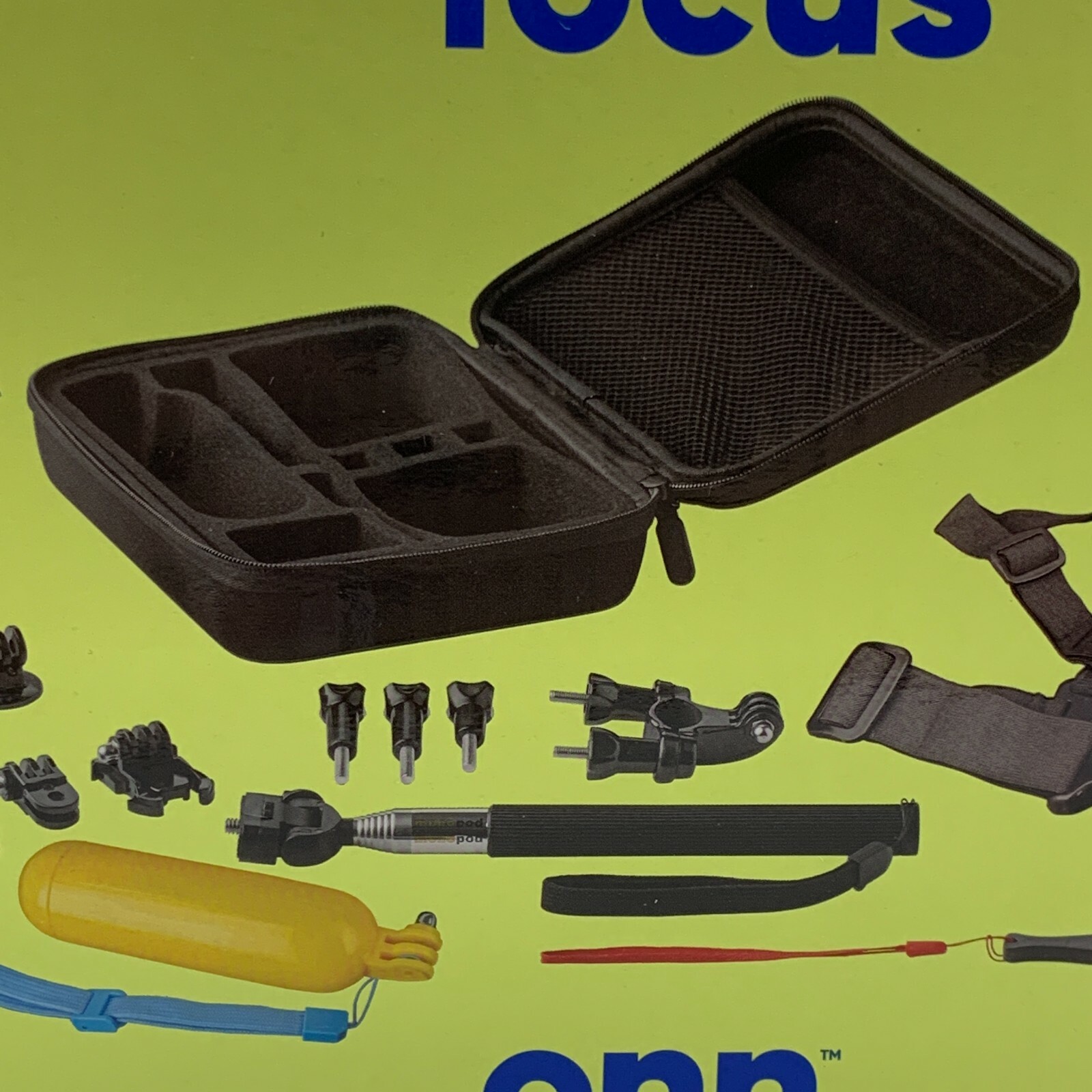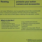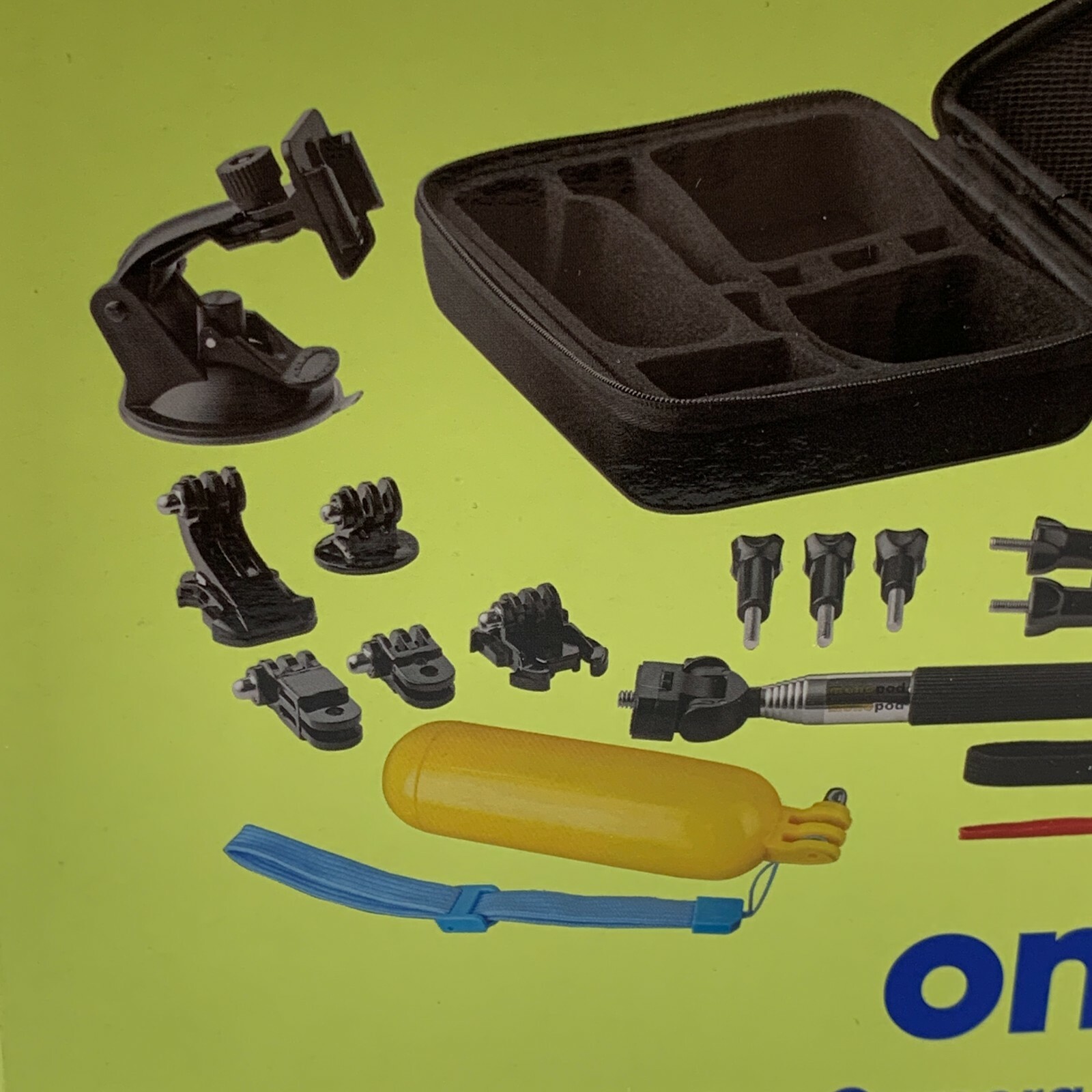 Action Camera Accessory Kit from onn 16 Pieces 1 Selfie Stick 1 Floating hand grip 1 Performance chest mount 1 Adjustable head mount 1 Bicycle handle bar mount 1 Car dashboard mount 5 Different mounting plates 3 Thumbscrews 1 Wrench 1 Rigid carrying case - fits an action camera and accessories Compatible with the Go Pro Hero Camera