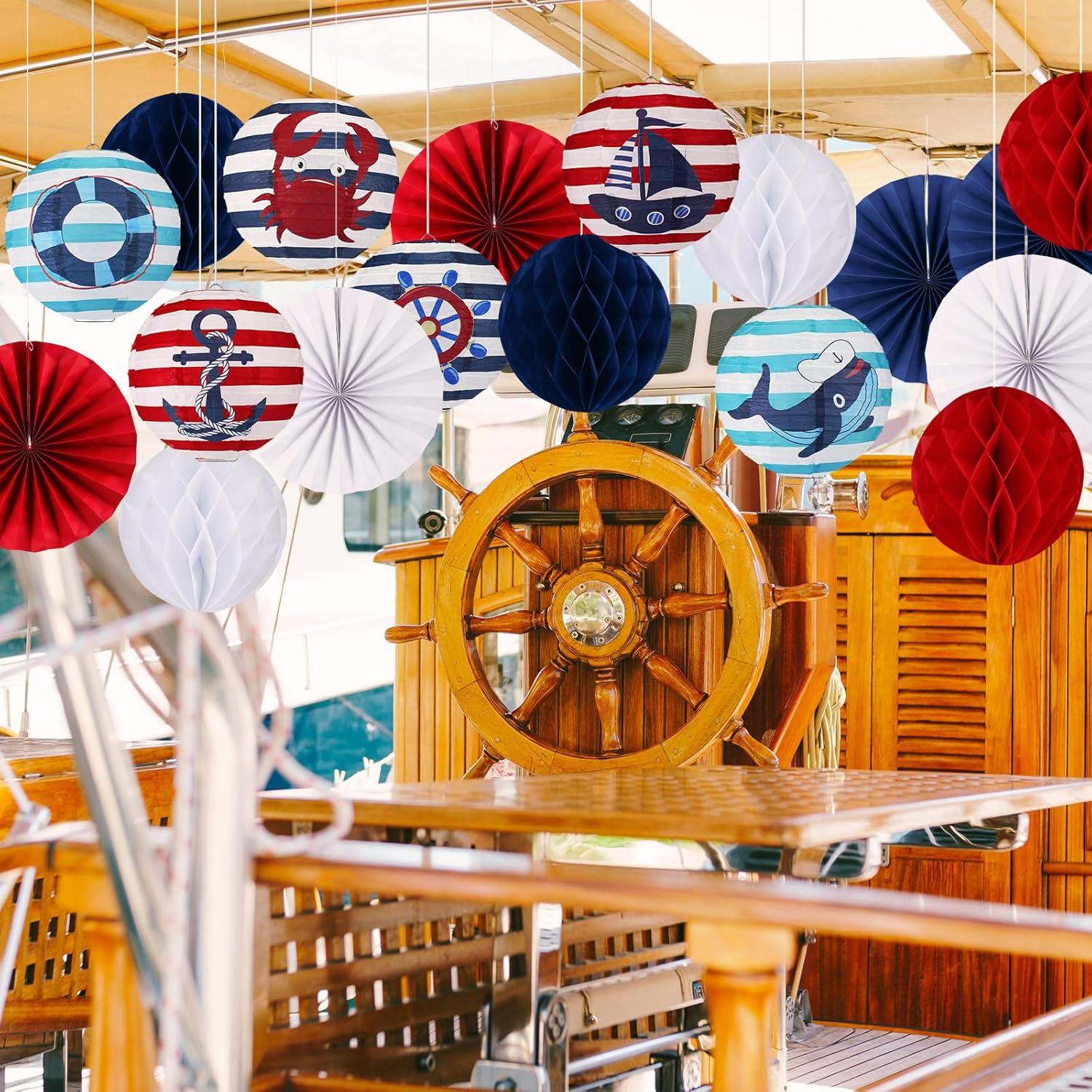 18 Pcs Nautical Theme Birthday Party Decorations Paper Lanterns Fans Honeycomb Nautical Theme Party Hanging Decoration Kit: you will receive 18 cruise party decoration items in total, including 6 navy blue themed paper lanterns in 6 different style, 6 themed paper fans, 6 themed honeycomb, sufficient quantity and diverse styles, meet nautical birthday party decorations, festival decor Quality Material: each anchor paper lantern and paper honeycomb ball is about 8 inches in diameter, paper fan is about 7.87 inches, big and eye catching, suitable for indoor and outdoor events; Cruise decoration paper lantern is made of quality paper and supported by a metal frame, reliable and stable materials are not easy to break, everything are paper products, please open them carefully to avoid meet water and prevent breakage Classic Patterns and Elements: these anchor hanging paper lanterns are designed with classic nautical elements, with anchor, crab, ship, ship wheel, whale and life ring, fit your party theme, capture the charm of the sea, and meet your decorative needs Easy to Install: nautical paper lantern is easy to hang, you just open it and support the outer layer of paper with a metal bracket, then you will get a paper lantern, also paper honeycomb ball and paper fans only need to be unfolded, simple and quick, most people can easily use this lantern to decorate your birthday party, welcome your guests to your party Wide Applications: these nautical party hanging decoration are nice for themed birthday parties, weddings, outdoor events, boat decor, are suitable for hanging on the porch, corridor, backyard, room and some places you like, bring guest a relaxing as well as a vivid atmosphere Features: Classic patterns and elements: These nautical themed party paper lanterns are designed, come in a variety of colors, white and red and blue, the images of nautical on these lanterns enhances the look of your party decorations. Widely applicable: These nautical are nice for pirate themed birthday parties, World navigation Day party, outdoor events, are suitable for hanging on the porch, corridor, backyard, room and some places you like, bring guest a relaxing as well as a lively atmosphere. Specifications: Main material: paper, metal Color: white red blue Size: Hanging Lantern: 8 inches Paper Honeycomb Ball: as the picture show Paper Fans: as the picture show Package includes: 6 x Hanging paper lanterns 6 x Honeycomb ball 6 x Paper fans Notes: Manual measurement, please allow slight errors on size. The color may exist a slight difference due to different screen displays. Item model number TOU--2806 Part Number TOU--2806 Batteries Required? No Item Package Quantity 18 Color white red blue Product Dimensions 8.27 x 8.27 x 1.38 inches Material paper, metal Assembled Width 8.27 inches Item Weight 9.9 ounces Assembled Length 8.27 inches Assembled Height 1.38 inches Complimentary Shipping and Easy Returns Need to return something? Enjoy our 30-day hassle-free return policy! Take advantage of free shipping across all 48 contiguous states! Your order will be dispatched within 1-2 business days once payment is confirmed. Your Opinion Matters! Your happiness is our main goal! We welcome your feedback! If you encounter any problems, reach out to us right away, and we’ll be here to help. Explore the Extraordinary! Our collection showcases fascinating products that are sure to capture your attention. What surprises await you? Delve in and discover unique items that enrich your daily life. Don't miss the amazing things we have in store for you!