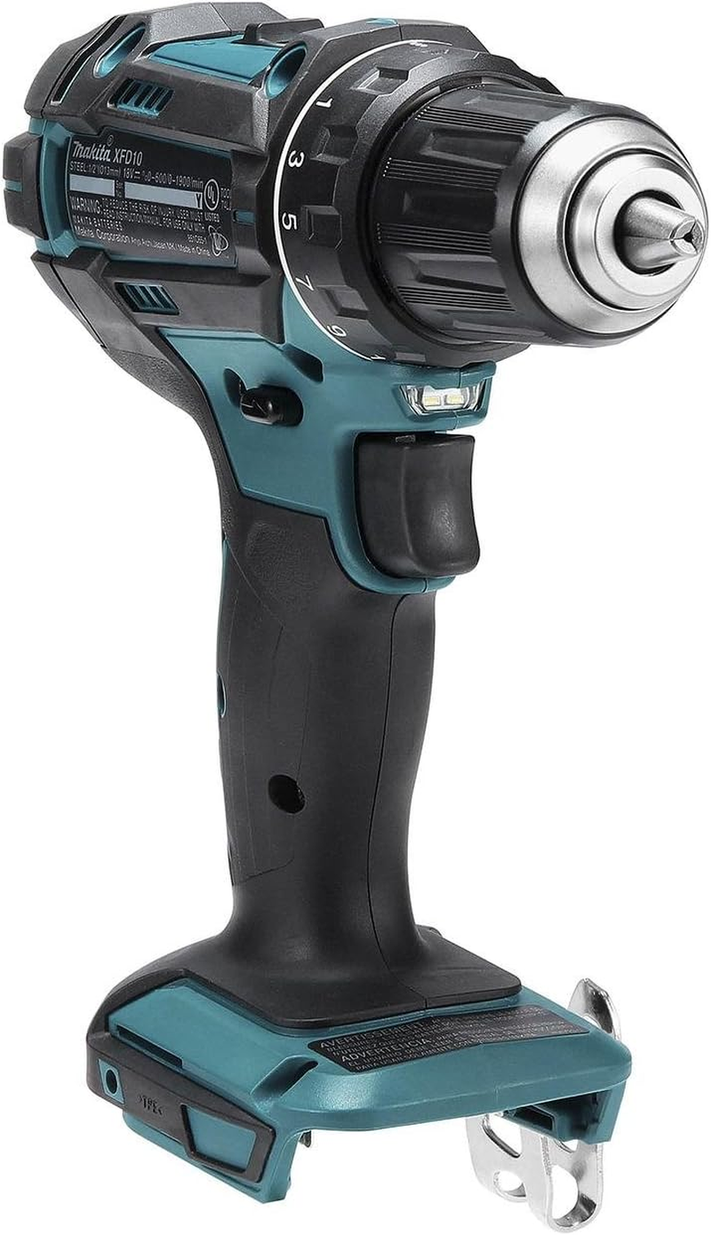 Makita-built 4-pole motor delivers 480 in. lbs. of Max Torque Mechanical 2-speed transmission (0-600 & 0-1,900 RPM) for a wide range of drilling and fastening applications Features Extreme Protection Technology (XPT) which is engineered to provide increased dust and water resistance in harsh job site conditions Dual L.E.D. lights with afterglow illuminate the work area Ergonomically designed handle with rubberized soft grip provides increased comfort The Makita 18V Compact Lithium-Ion Cordless 1/2" Driver-Drill (model XFD10Z, tool only, battery sold separately) delivers power, performance and superior ergonomics in a compact size, with an efficient 4-pole motor that delivers 480 in. lbs. of Max Torque and 25% more speed than the previous model.