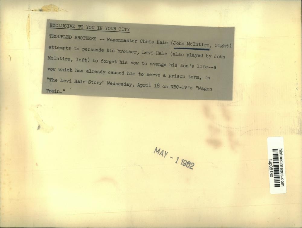 ebay template Note: Please study the images carefully to determine the condition of this vintage photograph, as it may not be in perfect condition. It may contain wrinkles, cracks, and possibly even tears due to its age and how it was handled before it got to us. A scanner may interpret colors and contrast differently than human eyes will, so it is possible that the actual photograph may be slightly darker or lighter in person. This vintage photograph is offered for sale as a collectible item and conveys no transfer of copyright. 1962 Press Photo John McIntire plays dual roles on NBC-TV's "Wagon Train" This is an original press photo. Wagonmaster Chris Hale (John McIntire, right) attempts to persuade his brother, Levi Hale (also played by John McIntire, left) to forget his vow to avenge his son's life - a vow which has already caused him to serve a pris PHOTO FRONT PHOTO BACK Historic Images Part Number: tup08180 Sell Smarter with Kyozou. Inventory and Ecommerce Management