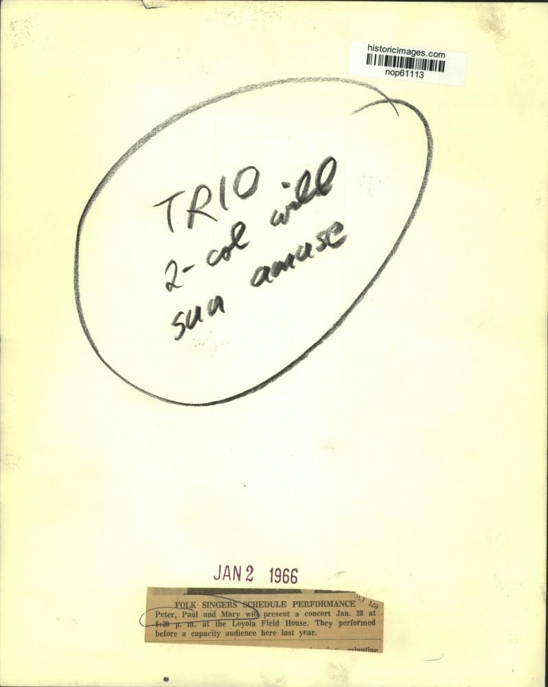 ebay template Note: Please study the images carefully to determine the condition of this vintage photograph, as it may not be in perfect condition. It may contain wrinkles, cracks, and possibly even tears due to its age and how it was handled before it got to us. A scanner may interpret colors and contrast differently than human eyes will, so it is possible that the actual photograph may be slightly darker or lighter in person. This vintage photograph is offered for sale as a collectible item and conveys no transfer of copyright. 1966 Press Photo Folk singing trio, Peter, Paul and Mary. - nop61113 This is an original press photo. Folk Singers Schedule Performance. Peter, Paul and Mary will present a concert January 28 at 8:30 p.m. at the Loyola Field House. They performed before a capacity audience here last year.Photo measures 8.25 x 10.25inches. Photo is dated 01-02-1966. PHOTO FRONT PHOTO BACK Historic Images Part Number: nop61113 Sell Smarter with Kyozou. Inventory and Ecommerce Management