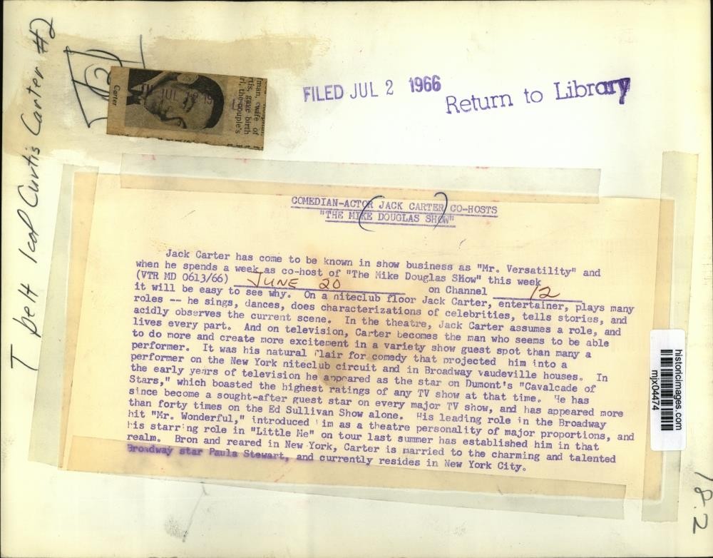 ebay template Note: Please study the images carefully to determine the condition of this vintage photograph, as it may not be in perfect condition. It may contain wrinkles, cracks, and possibly even tears due to its age and how it was handled before it got to us. A scanner may interpret colors and contrast differently than human eyes will, so it is possible that the actual photograph may be slightly darker or lighter in person. This vintage photograph is offered for sale as a collectible item and conveys no transfer of copyright. 1966 Press Photo Jack Carter, Actor - mjx04474 This is an original press photo. Jack Carter, actor and comedian is known in show business as "Mr. Versatility." When he host the "Mike Douglas Show," you'll be able to see why! Mr. Carter can sing, dance, do impressions of celebrities, and tell stories! He truly becomes his character whether is on screen or on stage. He is married to Broadway star Paula Stewart and they are currently residing in New York City.Photo measures 8 x 10.25inches. Photo is dated 07-02-1966. PHOTO FRONT PHOTO BACK Historic Images Part Number: mjx04474 Sell Smarter with Kyozou. Inventory and Ecommerce Management