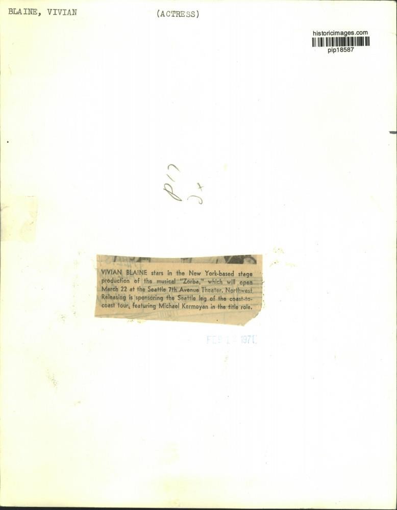 ebay template Note: Please study the images carefully to determine the condition of this vintage photograph, as it may not be in perfect condition. It may contain wrinkles, cracks, and possibly even tears due to its age and how it was handled before it got to us. A scanner may interpret colors and contrast differently than human eyes will, so it is possible that the actual photograph may be slightly darker or lighter in person. This vintage photograph is offered for sale as a collectible item and conveys no transfer of copyright. 1971 Press Photo Vivian Blaine stars in "Zorba," on Broadway. - pip18587 This is an original press photo. Actress - Vivian Blaine, starring in the New York musical hit "Zorba," as the fascinating Frenchwoman with a load of lovely, lingering memories.Photo measures 8 x 10.25inches. Photo is dated 2-12-1971. PHOTO FRONT PHOTO BACK Historic Images Part Number: pip18587 Sell Smarter with Kyozou. Inventory and Ecommerce Management