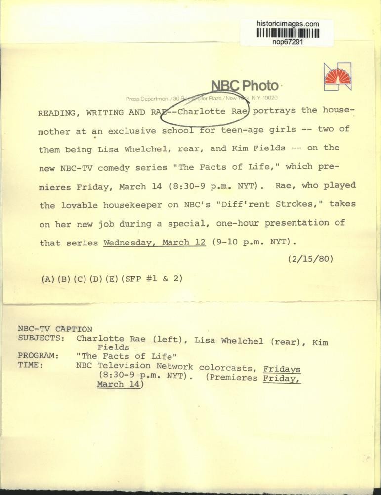 ebay template Note: Please study the images carefully to determine the condition of this vintage photograph, as it may not be in perfect condition. It may contain wrinkles, cracks, and possibly even tears due to its age and how it was handled before it got to us. A scanner may interpret colors and contrast differently than human eyes will, so it is possible that the actual photograph may be slightly darker or lighter in person. This vintage photograph is offered for sale as a collectible item and conveys no transfer of copyright. 1980 Press Photo Cast members of the NBC-TV's comedy series "The Facts of Life" This is an original press photo. Charlotte Rae portrays the housemother at an exclusive school for teen-age girls, two of them being Lisa Whelchel, rear, and Kim Fields, on the new NBC-TV comedy series "The Facts of Life," which premieres Friday, March 14 (8:30-9 pm, NYT). Rae, who played the lovable housekeeper on NBC's "Diff'rent Strokes," takes on her new job during a special, one-hour presentation of that series Wednesday, March 12 (9-10 pm NYT).Photo measures 7 x 9.25inches. Photo is dated 2-15-1980. PHOTO FRONT PHOTO BACK Historic Images Part Number: nop67291 Sell Smarter with Kyozou. Inventory and Ecommerce Management
