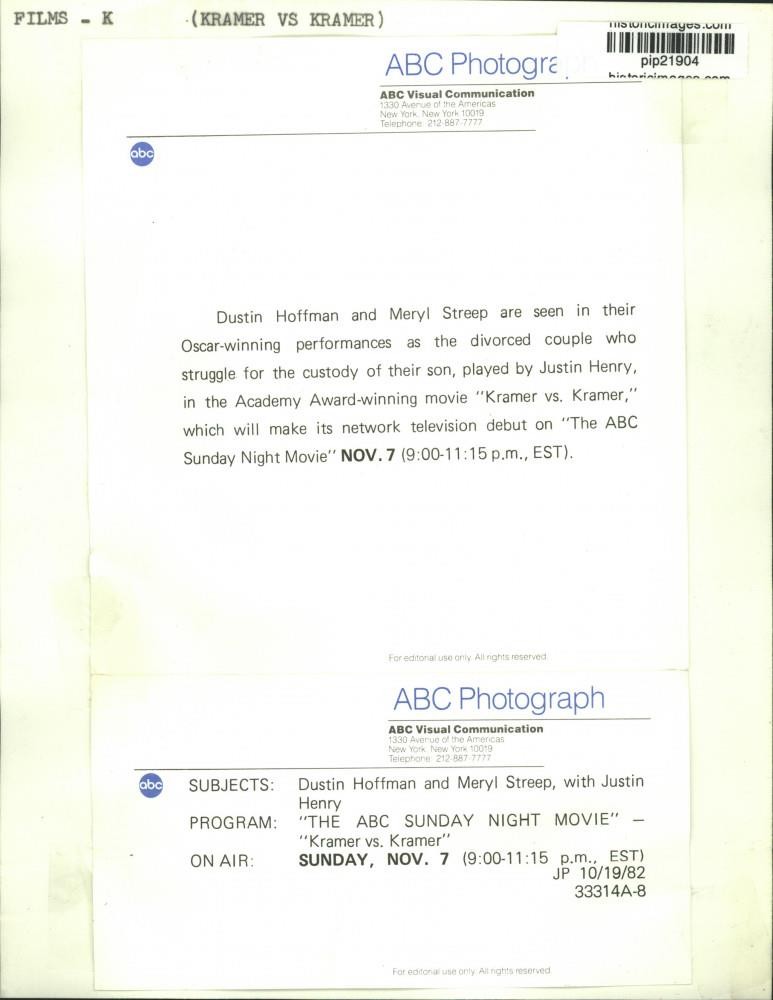 ebay template Note: Please study the images carefully to determine the condition of this vintage photograph, as it may not be in perfect condition. It may contain wrinkles, cracks, and possibly even tears due to its age and how it was handled before it got to us. A scanner may interpret colors and contrast differently than human eyes will, so it is possible that the actual photograph may be slightly darker or lighter in person. This vintage photograph is offered for sale as a collectible item and conveys no transfer of copyright. 1982 Press Photo The starring cast of "Kramer vs. Kramer," on ABC Television. This is an original press photo. Films - Dustin Hoffman and Meryl Streep are seen in their Oscar-winning performances as the divorced couple who struggle for the custody of their son, played by Justin Henry, in the Academy Award-winning movie "Kramer vs. Kramer," which will make its network television debut on "The ABC Sunday Night Movie."Photo measures 7 x 9.25inches. Photo is dated 10-19-1982. PHOTO FRONT PHOTO BACK Historic Images Part Number: pip21904 Sell Smarter with Kyozou. Inventory and Ecommerce Management
