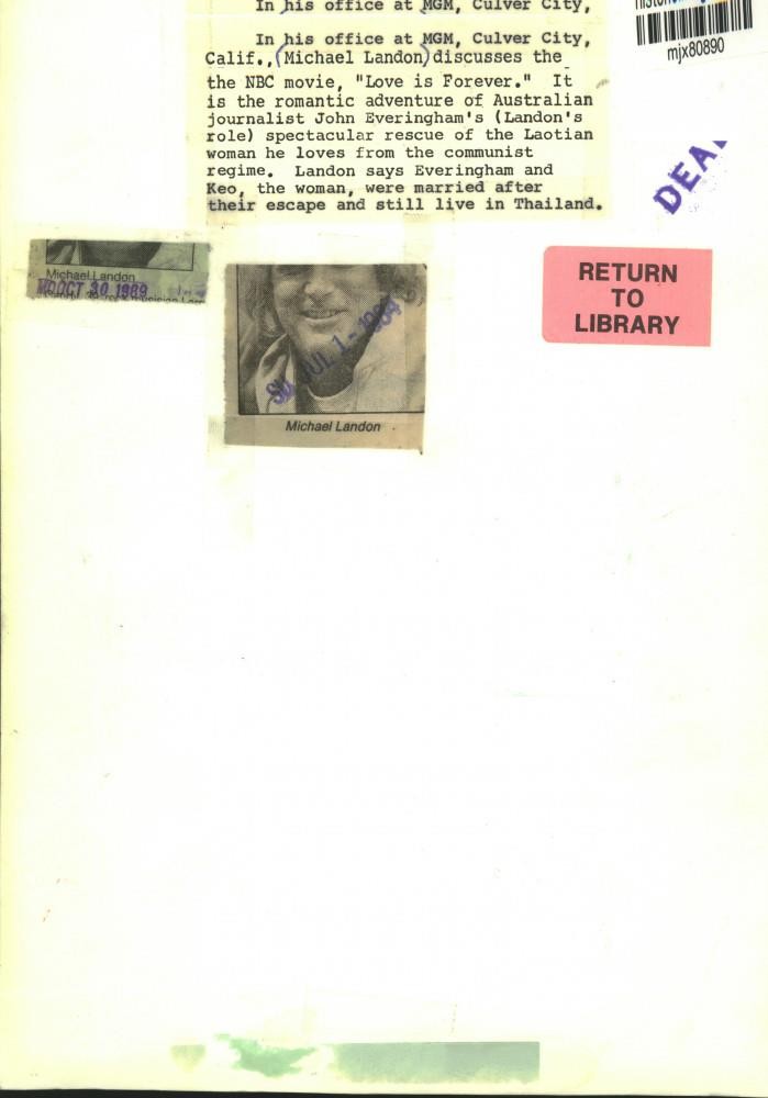 ebay template Note: Please study the images carefully to determine the condition of this vintage photograph, as it may not be in perfect condition. It may contain wrinkles, cracks, and possibly even tears due to its age and how it was handled before it got to us. A scanner may interpret colors and contrast differently than human eyes will, so it is possible that the actual photograph may be slightly darker or lighter in person. This vintage photograph is offered for sale as a collectible item and conveys no transfer of copyright. 1984 Press Photo Michael Landon as John Everingham in "Love is Forever" This is an original press photo. In his office at MGM, Culver City, California, Michael Landon discusses the NBC movie, "Love is the Forever." It is the romantic adventure of Australian journalist John Everingham's (Landon's role) spectacular rescue of the Laotian woman he loves from the communist regime. Landon says Everingham and Keo, the woman, were married after their escape and still live in Thailand. Photo measures 7.75 x 11.25inches. Photo is dated 07-01-1984. PHOTO FRONT PHOTO BACK Historic Images Part Number: mjx80890 Sell Smarter with Kyozou. Inventory and Ecommerce Management